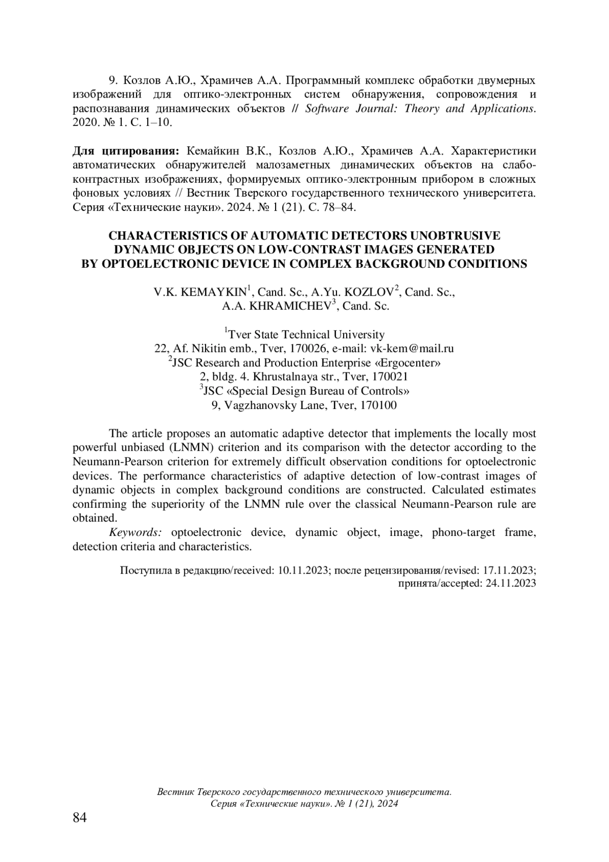 9. Козлов А.Ю., Храмичев А.А. Программный комплекс обработки двумерных изображений для оптико-электронных систем обнаружения, сопровождения и распознавания динамических объектов // Software Journal: Theory and Applications. 2020. № 1. С. 1-10. EDN: YMBCOQ