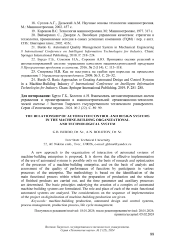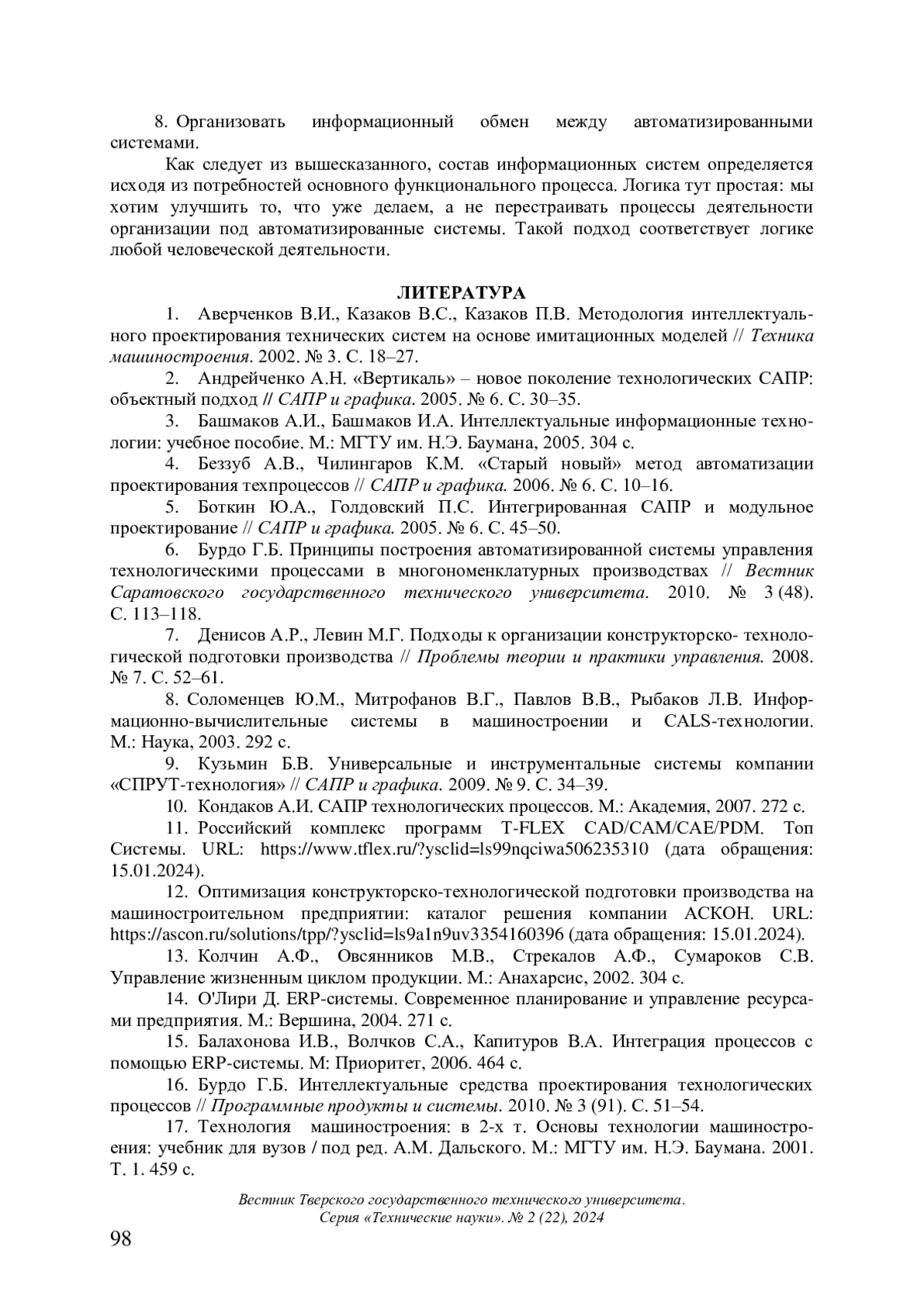 БУРДО Г. Б., БОЛОТОВ А. Н. ВЗАИМОСВЯЗЬ АВТОМАТИЗИРОВАННЫХ СИСТЕМ УПРАВЛЕНИЯ И ПРОЕКТИРОВАНИЯ В МАШИНОСТРОИТЕЛЬНОЙ ОРГАНИЗАЦИОННО-ТЕХНОЛОГИЧЕСКОЙ СИСТЕМЕ // ВЕСТНИК ТВЕРСКОГО ГОСУДАРСТВЕННОГО ТЕХНИЧЕСКОГО УНИВЕРСИТЕТА. СЕРИЯ: ТЕХНИЧЕСКИЕ НАУКИ. 2024. № 2 (22)
