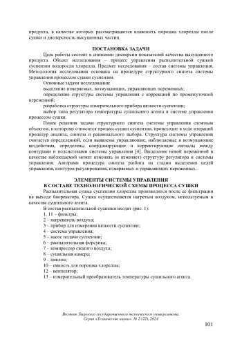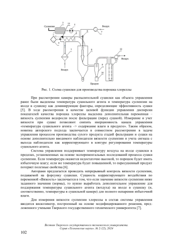 Представлены результаты, полученные в ходе процедур структурного синтеза систем управления сушкой суспензии микроводоросли. Снижение дисперсии показателей качества порошка хлореллы обеспечивается за счет использования корректирующего воздействия по вязкости суспензии в регуляторе температуры сушильного агента. Вязкость измеряется перед подачей суспензии на распылительное сопло дополнительно введенным в состав системы управления прибором. Рассмотрена структура измерителя вязкости суспензии. В качестве регулятора температуры предлагается применять нечеткий регулятор температуры сушильного агента. Лингвистическая оценка регулируемого и корректирующего воздействий осуществляяется по трем термам на основе прямоугольных функций принадлежности.