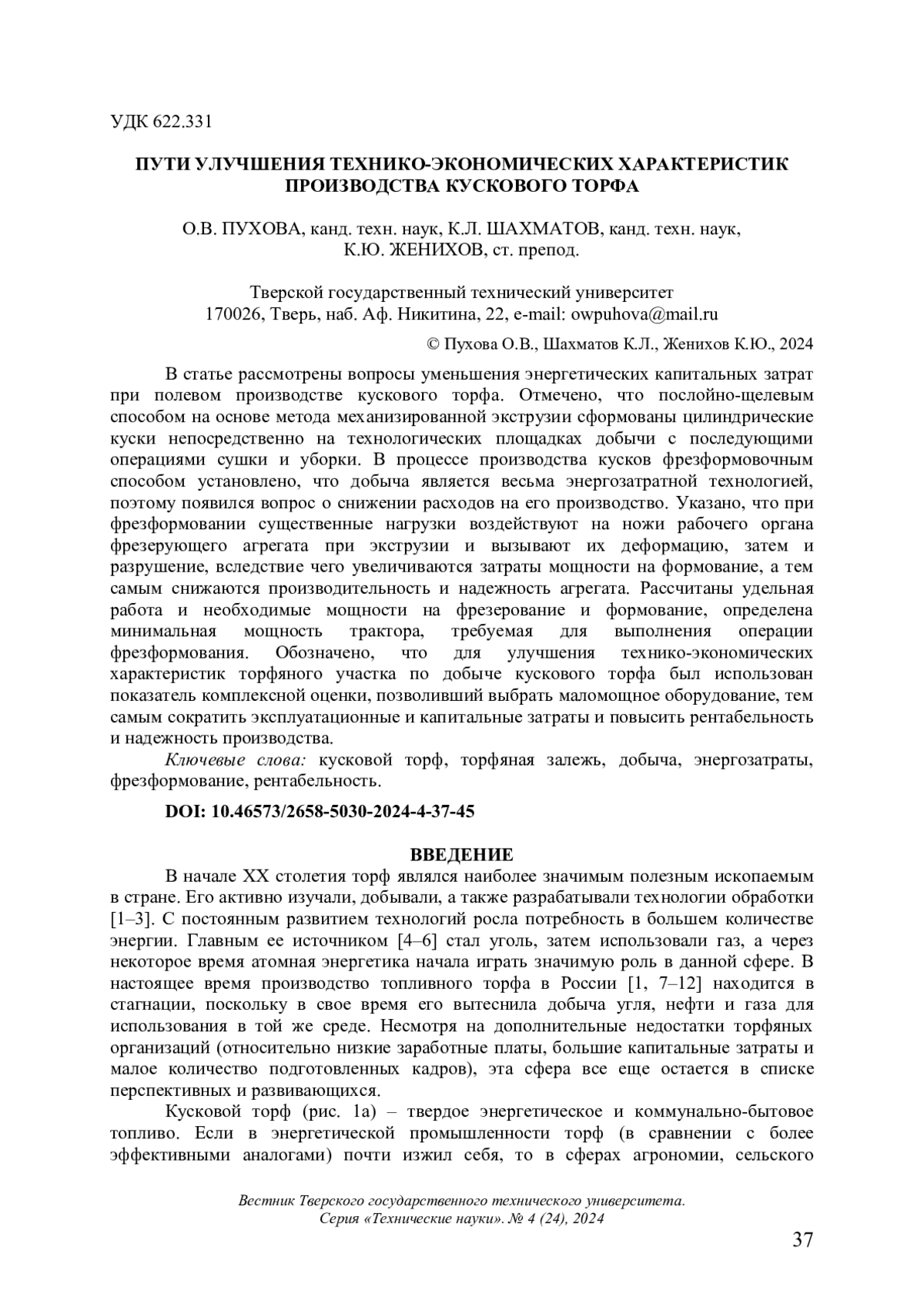 В начале XX столетия торф являлся наиболее значимым полезным ископаемым в стране. Его активно изучали, добывали, а также разрабатывали технологии обработки [1–3]. С постоянным развитием технологий росла потребность в большем количестве энергии. Главным ее источником [4–6] стал уголь, затем использовали газ, а через некоторое время атомная энергетика начала играть значимую роль в данной сфере. В настоящее время производство топливного торфа в России [1, 7–12] находится в стагнации, поскольку в свое время его вытеснила добыча угля, нефти и газа для использования в той же среде. Несмотря на дополнительные недостатки торфяных организаций (относительно низкие заработные платы, большие капитальные затраты и малое количество подготовленных кадров), эта сфера все еще остается в списке перспективных и развивающихся