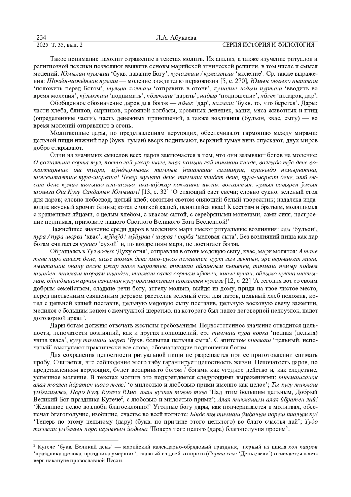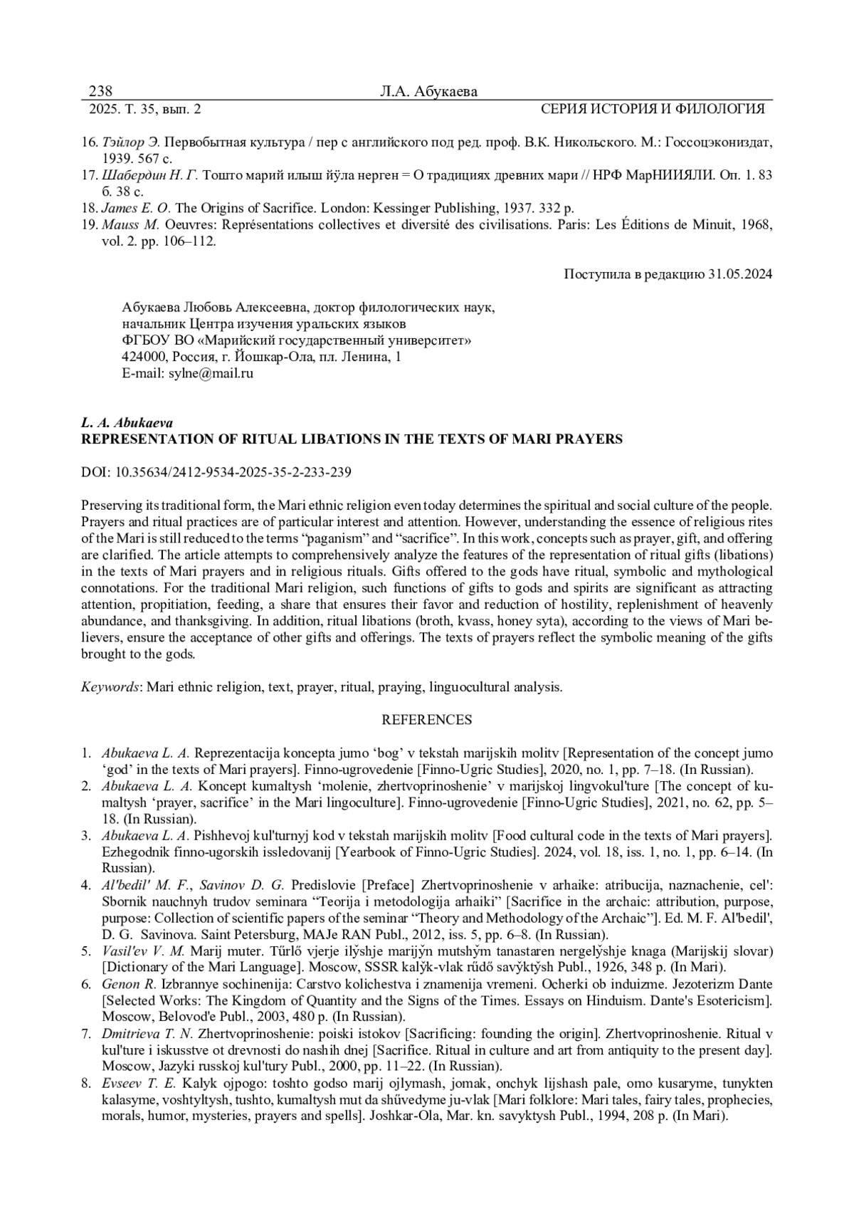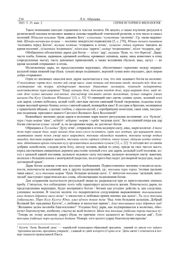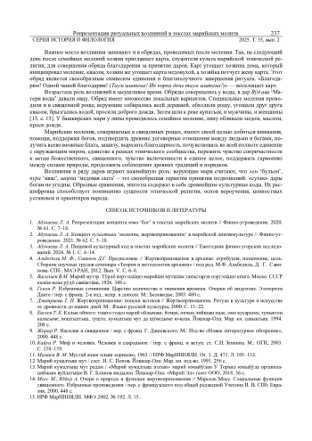 3. Абукаева Л. А. Пищевой культурный код в текстах марийских молитв // Ежегодник финно-угорских исследований. 2024. № 1. С. 6-14. EDN: ATIKCL