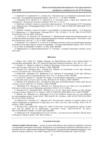 7. Тимошенко В. Н., Музыка А. А., Москалев А. А. Тепловой стресс у коров. Как сохранить продуктивность? // Белорусское сельское хозяйство. 2016. № 7. С. 42-47.