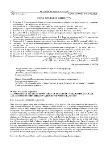 1. Бехнамади Л. Полные и краткие формы прилагательные в современном русском языке (семантика, стилистика и синтаксис) // URL: https://www.inst.at/trans/25.