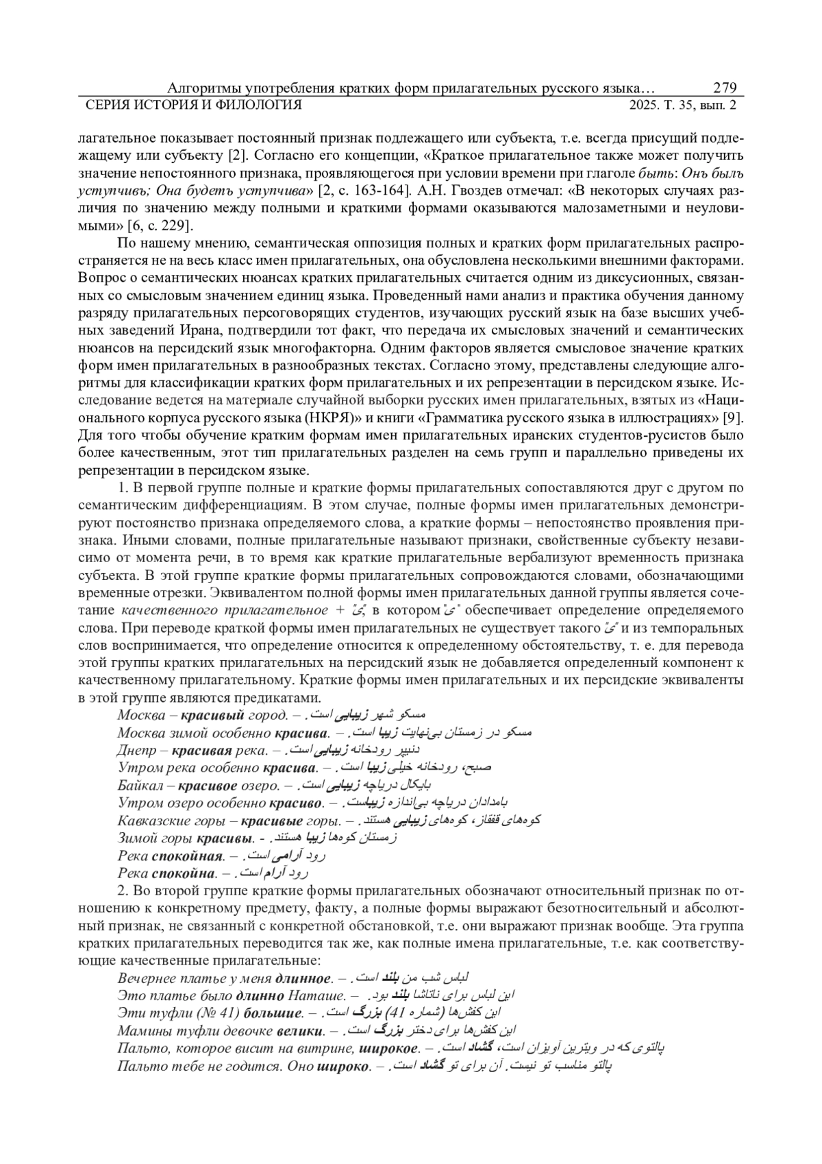 Краткие прилагательные выражают наряду с временным признаком прилагательного также и его постоянный и абсолютный признак. Краткие формы прилагательных воспринимаются иранскими студентами только как прилагательные временного значения и потому при переводе на родной язык употребляют эквиваленты прилагательных временного значения для всех типов кратких форм прилагательных. Также иранские студенты-русисты легко постигают значения полных форм прилагательных, однако, исходя из опыта преподавания, было выявлено что, при формулировании значений кратких форм прилагательных они испытывают определенные трудности передачи их на родной язык, заменяя эквивалентами полных форм прилагательных русского языка. Актуальность данного исследования заключается в том, что до настоящего времени краткие формы имен прилагательных не подвергались тщательному анализу исследователями русского языка в Иране, что и привело к малоизученности данного типа прилагательных и отсутствию адекватных способов их вербализации в персидском языке. В статье представлены всевозможные способы репрезентации в персидском языке постоянных и временных значений кратких форм прилагательных в русском языке. Авторы статьи концентрируют свое внимание на выявлении и формулировании семантических критериев употребления кратких форм прилагательных, пытаются найти некий общий алгоритм, имеющий объяснительную силу. Научная новизна данного исследования заключается в том, что в нем впервые даются модели значений и сферы употребления кратких форм прилагательных в переводном аспекте путем выявления адекватных способов передачи их на персидский язык.