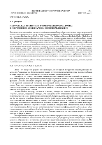 В статье исследуется метафора как инструмент формирования образа войны в современном англоязычном медийном дискурсе. Анализируются статьи и комментарии пользователей, опубликованные на онлайн-платформах таких газет, как «The Guardian», «The New York Times», «The Washington Times», «The Daily Mail», «The Independent». В статье определяются функциональные особенности и эмоциональная нагрузка метафор войны в новостных статьях и пользовательских комментариях рассматриваемых газет. Изучается контекстуальное использование метафор войны и их роль в обогащении языка англоязычных СМИ. Выявляется, что использование метафор, связанных с войной, выводит на первый план такие концепты, как «борьба», «атака», «защита» и «победа», которые могут применяться не только в контексте социально-политических конфликтов, но и в контексте бизнеса, политики, а также в сфере личных взаимоотношений. Результаты исследования показывают, что распространенное использоваие образов войны в англоязычном медийном дискурсе приводит к созданию эффекта манипуляции общественным мнением, в сознании читателей формируются устойчивые образы и стереотипы, связанные с войной. Анализ метафор в рамках исследования также демонстрирует, что использование вербальных образов войны может способствовать возникновению напряженности в обществе и эскалации уже существующих конфликтов.