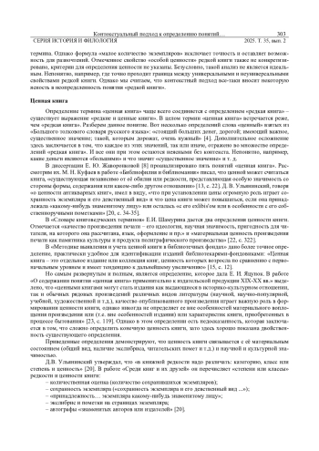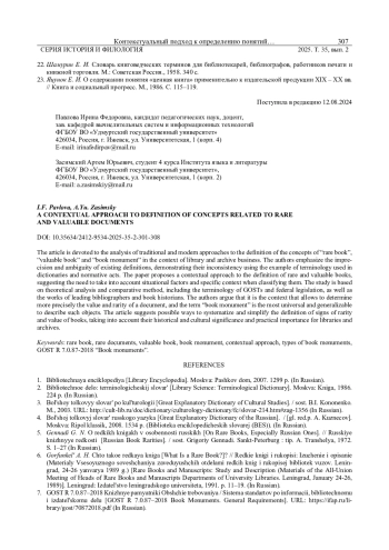 Статья посвящена анализу традиционных и современных подходов к определению понятий «редкая книга», «ценная книга» и «книжный памятник» в контексте библиотечного и архивного дела. Авторы акцентируют внимание на неточности и неясности существующих дефиниций, демонстрируя их противоречивость на примере терминологии, используемой в словарях и нормативных актах. В работе предложен контекстуальный подход к определению редких и ценных книг, предполагающий необходимость учета ситуационных факторов и конкретного контекста при их классификации. Исследование опирается на теоретический анализ и сравнительный метод, включая терминологию ГОСТов и федерального законодательства, а также работы ведущих библиографов и книговедов. Авторы утверждают, что именно контекст позволяет точнее определить ценность и редкость документа, а термин «книжный памятник» является наиболее универсальным и обобщающим для описания подобных объектов. Статья предлагает возможные пути систематизации и упрощения определения признаков редкости и ценности книг с учетом их историко-культурного значения и практической значимости для библиотек и архивов.