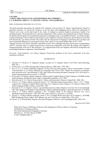 В статье описано и проанализировано отношение И. С. Тургенева к роману Л. Н. Толстого «Анна Каренина». С опорой на эпистолярные материалы прослеживается, как Тургенев, с одной стороны, с неослабевающим интересом следит за публикацией нового романа Толстого, с другой - по ходу чтения высказывает скептические оценки, преимущественно идеологического характера. Патриархальная социально-экономическая организация хозяйства, патриархальный тип семейных отношений, отрицание европейского социально-институционального опыта обустройства общества как непригодного для России - весь комплекс идей, лежащий в основе мировоззрения и характера Левина, вызывает у Тургенева неприятие и тревогу, так как за Левиным он, как и Ф. М. Достоевский, видит самого Толстого. В статье отмечены пересечения позиций Тургенева и Достоевского и принципиальные их расхождения в оценке образа «эгоиста» Левина и Балканской войны 1877-1878 гг. Словом «хаос» Тургенев обозначает преимущественно взгляды писателя, хотя из его переписки с П. В. Анненковым становится понятно, что в определенной степени речь идет и о композиции сюжета. По аналогии с изменившимся восприятием Тургеневым романа «Война и мир», высказывается предположение, что в данном случае Тургеневу не хватило временной и психологической дистанции, чтобы по достоинству оценить «Анну Каренину».