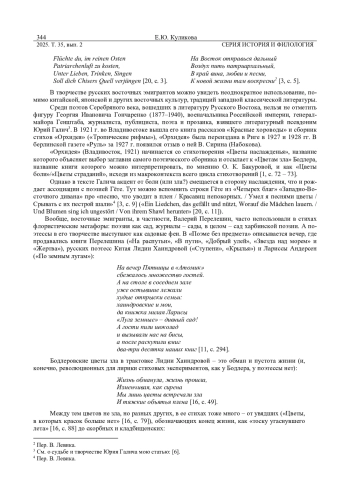 В творчестве русских восточных эмигрантов можно увидеть неоднократное использование, помимо китайской, японской и других восточных культур, традиций западной классической литературы. Сборник Юрия Галича «Орхидея» (Владивосток, 1921) начинается со стихотворения «Цветы наслажденья», название которого объясняет выбор заглавия самого поэтического сборника и отсылает к «Цветам зла» Бодлера. Тем не менее бодлеровский метафорический контекст почти не используется Галичем, не играет контрастно на изображении цветов и человеческих пороков, однако дополняется перекличкой с гётевскими «Нашел» («Gefunden») и «Дикая роза» («Heidenröslein»). Стихотворение Николая Светлова посвящено цветку Ван-Хао, который мгновенно гибнет от прикосновения грубых пальцев. Аналогия с неукротимостью страстей, с их смертоносной силой, вероятно, заимствована из гётевских «Gefunden» и «Heidenröslein». Светлов в описании китайского цветка отсылает читателя к афоризму Конфуция, однако и западная литературная линия отчетливо проступает в тексте. Страсть оказывается пороком, как у Бодлера, а грубая сила - «царством зла», обозначенным Гёте в поэтической интериоризации противопоставления природного и человеческого мира.