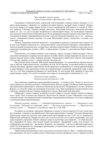 Стихотворение Н. Заболоцкого «Уступи мне, скворец, уголок…» (1946), на первый взгляд, видится пейзажным. Написанное автором с натурфилософской концепцией, оно зачастую и интерпретируется в школьной практике и мелодекламациях как произведение о весеннем пробуждении природы и пении скворца. Но эти темы лежат лишь на поверхности стихотворения. Поэт, прошедший перипетии сталинских лагерей и чудом возвратившийся в 1946 г. в Москву, в этом произведении выражает травму на уровнях фразеологии и художественных тропов, субъектно-объектной организации, пространства и времени (хронотоп, локус), композиции и лирического сюжета. Напуганный арестом, годами лагерей и ссылкой в Караганду, поэт не осмеливается прямо выражать свои переживания. Он заменяет первоначально записанную смелую шестую строфу на более осторожную, жертвуя эстетическим её качеством. Для описания несвободы в советской стране Заболоцкий в изображении весенней природы прибегает к карнавализации (М. Бахтин), с одной стороны, живописуя торжество победы советского народа в Великой Отечественной войне и своего временного освобождения от тягот существующего строя, а с другой, парадоксально демонстрируя давление и насилие сталинского режима.