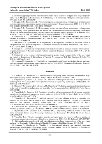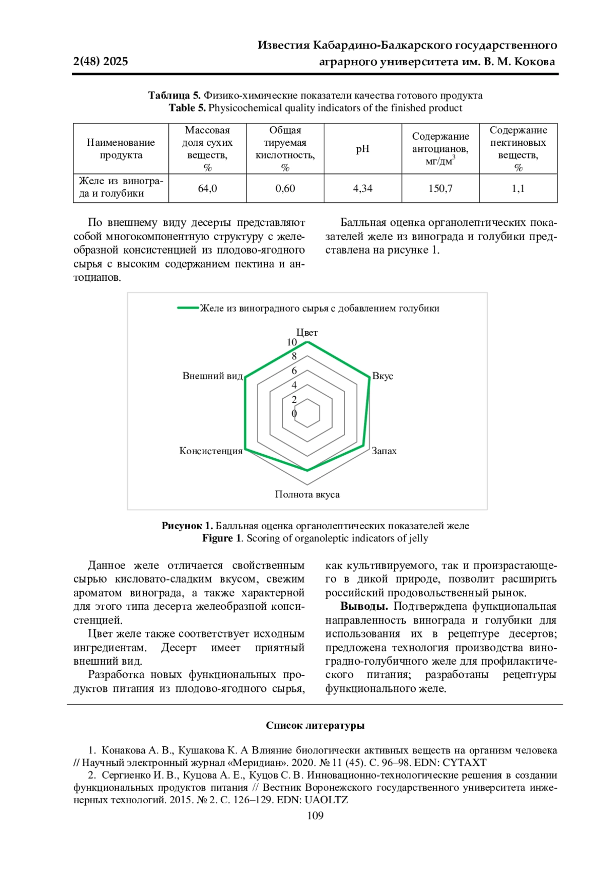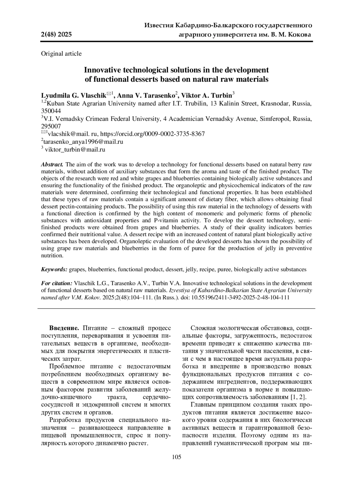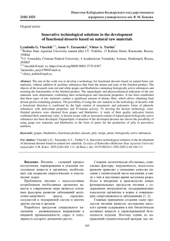 ВЛАЩИК Л. Г., ТАРАСЕНКО А. В., ТУРБИН В. А. ИННОВАЦИОННЫЕ ТЕХНОЛОГИЧЕСКИЕ РЕШЕНИЯ В РАЗРАБОТКЕ ФУНКЦИОНАЛЬНЫХ ДЕСЕРТОВ НА ОСНОВЕ НАТУРАЛЬНОГО СЫРЬЯ // ИЗВЕСТИЯ КАБАРДИНО-БАЛКАРСКОГО ГОСУДАРСТВЕННОГО АГРАРНОГО УНИВЕРСИТЕТА ИМ. В. М. КОКОВА. 2025. № 2 (48)
