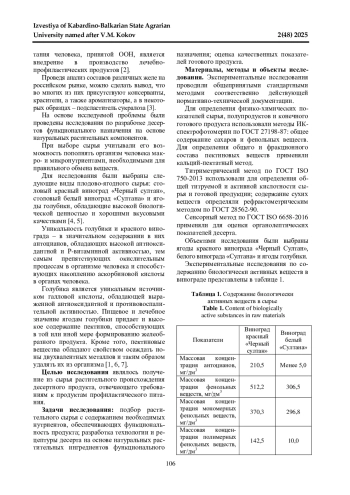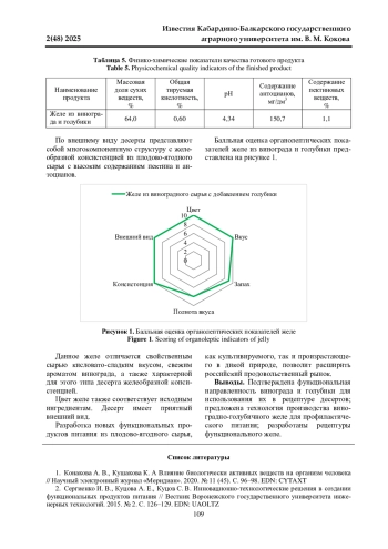Целью исследования явилась разработка технологии десертов функционального назначения на основе натурального ягодного сырья без дополнительного внесения вспомогательных веществ, формирующих аромат и вкус готового продукта. Для исследования использовали виноград красного и белого сортов и голубику, содержащие биологически активные вещества и обеспечивающие функциональность готового продукта. Определены органолептические и физико-химические показатели сырья, подтверждающие их технологические и функциональные свойства. Установлено, что данные виды сырья содержат значительное количество пищевых волокон, позволяющих получить десертные пектиносодержащие продукты. Возможность использования данного сырья в технологии десерта с функциональным направлением обусловлена также высоким содержанием мономерных и полимерных форм фенольных веществ, обладающих антиоксидантными свойствами и Р-витаминной активностью. Для разработки технологии десерта были получены полуфабрикаты из винограда и голубики. Исследование качественных показателей ягод подтвердило их пищевую ценность. Разработана рецептура десерта с повышенным содержанием натуральных растительных биологически активных веществ. Органолептическая оценка разработанных десертов выявила возможность применения виноградного сырья и ягод голубики в виде пюре для производства желе в профилактическом питании.