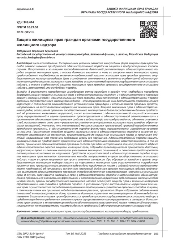 КАРЯГИНА В. С. ЗАЩИТА ЖИЛИЩНЫХ ПРАВ ГРАЖДАН ОРГАНАМИ ГОСУДАРСТВЕННОГО ЖИЛИЩНОГО НАДЗОРА // ПРОБЕЛЫ В РОССИЙСКОМ ЗАКОНОДАТЕЛЬСТВЕ. 2023. Т. 16 № 8 (36 СТ.)