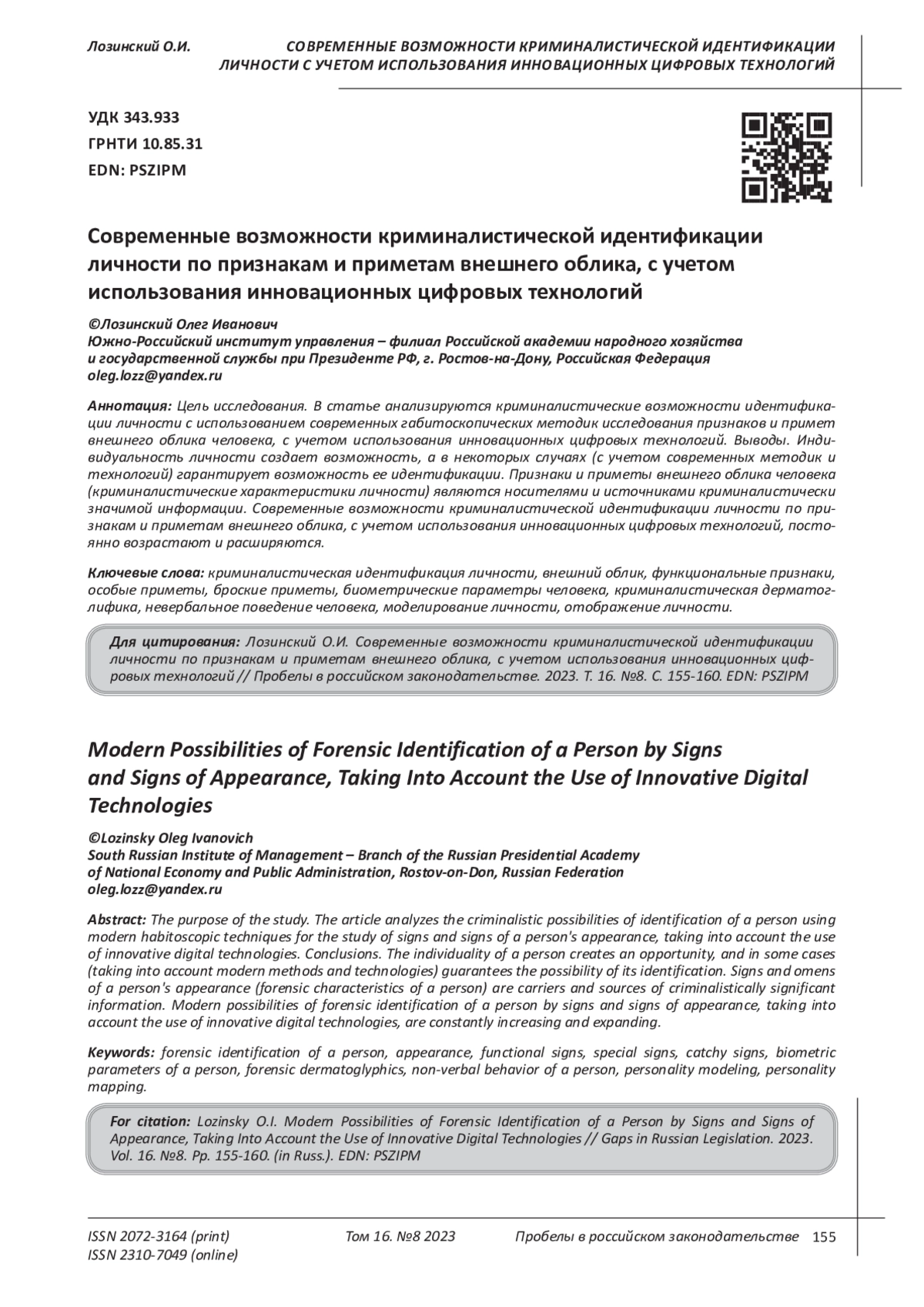 ЛОЗИНСКИЙ О. И. СОВРЕМЕННЫЕ ВОЗМОЖНОСТИ КРИМИНАЛИСТИЧЕСКОЙ ИДЕНТИФИКАЦИИ ЛИЧНОСТИ ПО ПРИЗНАКАМ И ПРИМЕТАМ ВНЕШНЕГО ОБЛИКА, С УЧЕТОМ ИСПОЛЬЗОВАНИЯ ИННОВАЦИОННЫХ ЦИФРОВЫХ ТЕХНОЛОГИЙ // ПРОБЕЛЫ В РОССИЙСКОМ ЗАКОНОДАТЕЛЬСТВЕ. 2023. Т. 16 № 8 (36 СТ.)