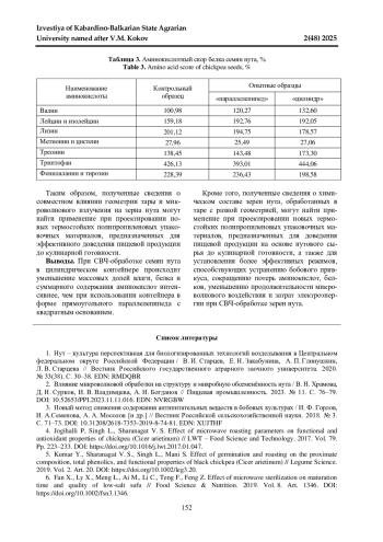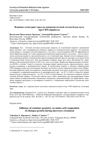 Нут - богатый источник питательных веществ, не получивший широкого применения ввиду наличия у него специфического бобового привкуса и антипитательных веществ. Эту проблему можно решить с помощью тепловой обработки, в том числе с использованием СВЧ. На эффективность такой обработки влияют не только параметры воздействия микроволнового излучения - частота магнетрона, выходная мощность, продолжительность, но и геометрия тары. Данная статья посвящена изучению влияния различных геометрических форм полипропиленовой тары на массовые доли влаги, белка и аминокислотный состав нута. Для исследования отобраны зерна нута сорта «Волжанин-50», выращенные в Волгоградской области в 2023 году, часть из которых обработана микроволновым излучением (400 Вт в течение 3 минут) в емкостях, имеющих форму прямоугольного параллелепипеда с квадратным основанием и цилиндрическую форму. В контрольном (сырых) и опытных (обработанных СВЧ) образцах семян нута исследованы массовые доли влаги и белка, аминокислотный состав. Микроволновая обработка зерен нута привела к уменьшению массовой доли влаги (в среднем в 3 раза), белка и суммарного содержания аминокислот (в цилиндрической таре - на 28,7 и 24,6%; в ѐмкости в форме прямоугольного параллелепипеда - на 21,6 и 18,6% соответственно), но позволила устранить нежелательный бобовый привкус. Результаты работы могут найти применение при проектировании новых термостойких полипропиленовых упаковочных материалов, предназначенных для эффективного доведения пищевой продукции до кулинарной готовности с сохранением наибольшего количества питательных веществ.