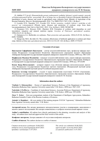12. Посыпанов Г. С., Князев Б. М., Жеруков Б. Х. Формирование урожая сои в зависимости от инокуляции семян, орошения и режима минерального питания // Известия Тимирязевской сельскохозяйственной академии. 1990. № 10. С. 43-44.