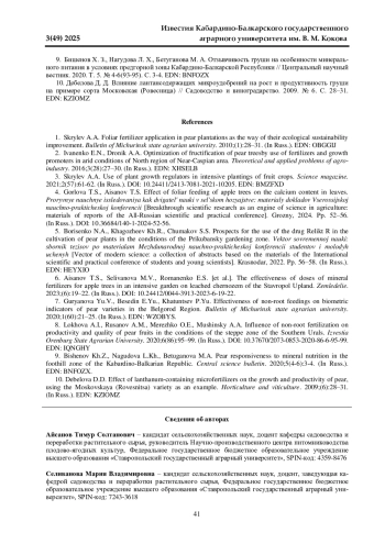 9. Бишенов Х. З., Нагудова Л. Х., Бетуганова М. А. Отзывчивость груши на особенности минерального питания в условиях предгорной зоны Кабардино-Балкарской Республики // Центральный научный вестник. 2020. Т. 5. № 4-6(93-95). С. 3-4. EDN: BNFOZX