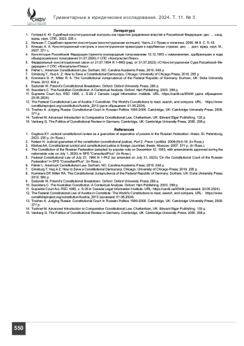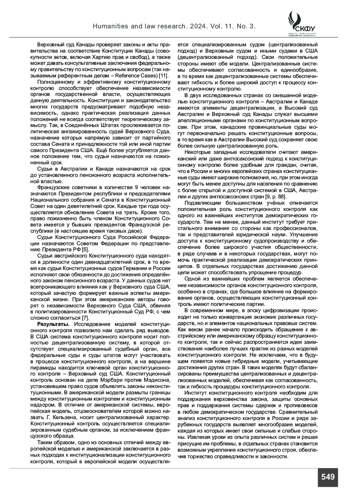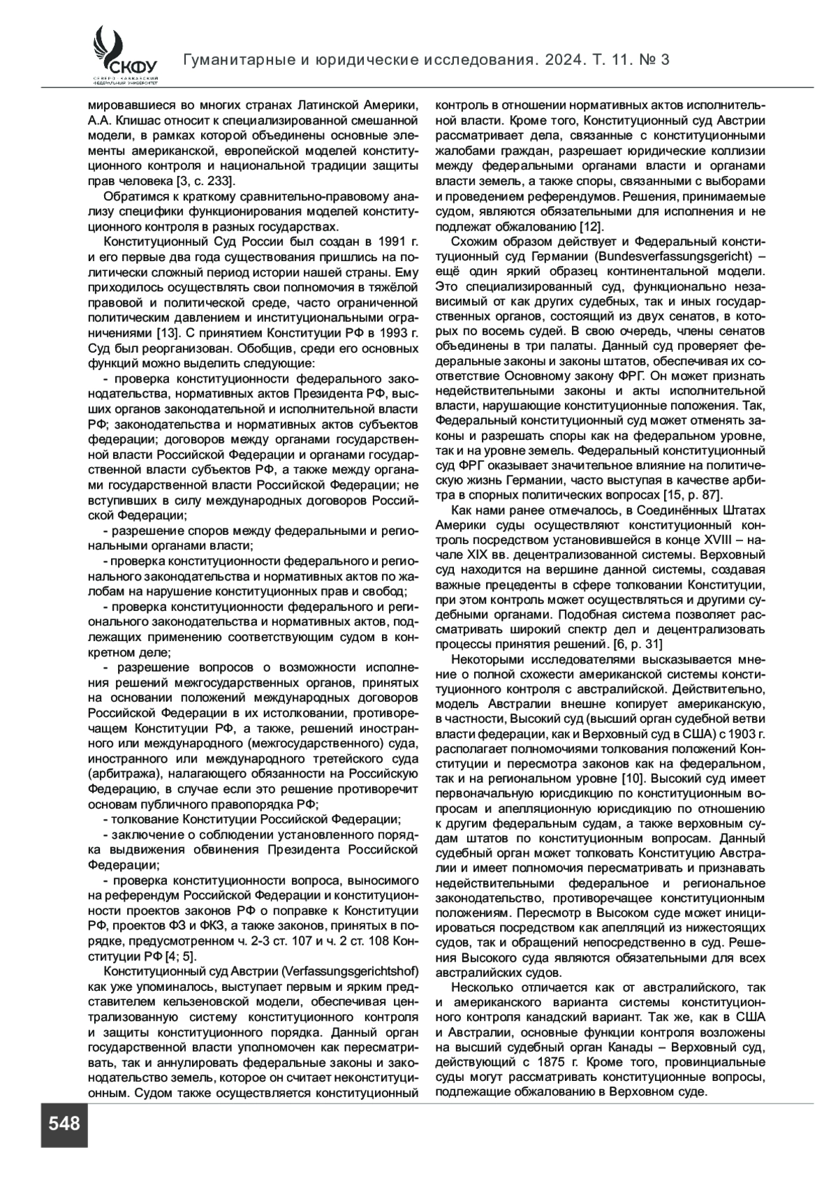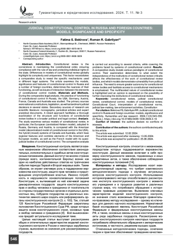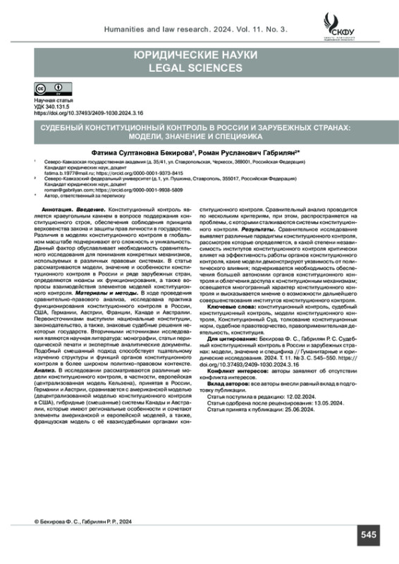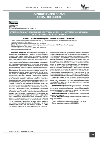 БЕКИРОВА Ф. С., ГАБРИЛЯН Р. Р. СУДЕБНЫЙ КОНСТИТУЦИОННЫЙ КОНТРОЛЬ В РОССИИ И ЗАРУБЕЖНЫХ СТРАНАХ: МОДЕЛИ, ЗНАЧЕНИЕ И СПЕЦИФИКА // ГУМАНИТАРНЫЕ И ЮРИДИЧЕСКИЕ ИССЛЕДОВАНИЯ. 2024. ТОМ 11, № 3