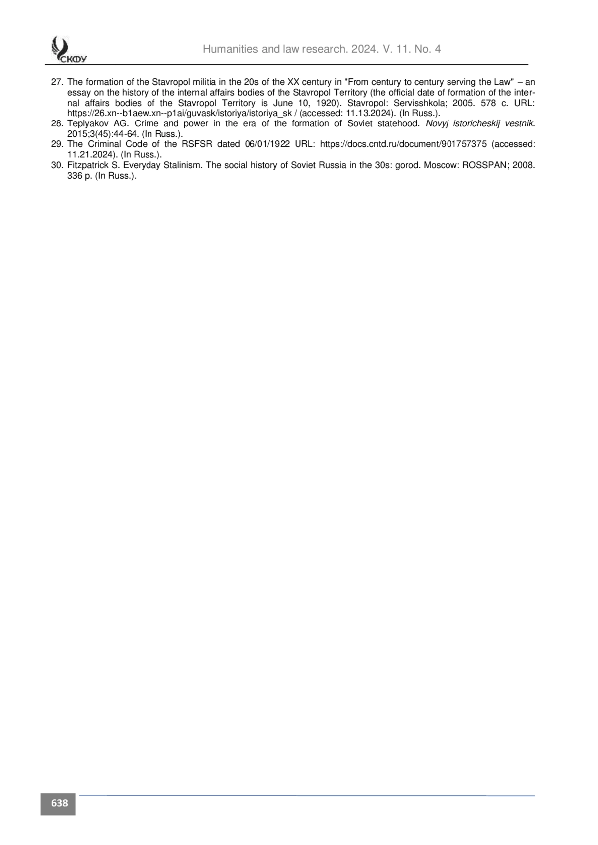 23. Никулин В. В. Преступность как социально-правовое явление в 1920-е годы: тенденции и состояние // Исторические, философские, политические и юридические науки, культурология и искусствоведение. Вопросы теории и практики. 2009. № 2. С. 55-60.