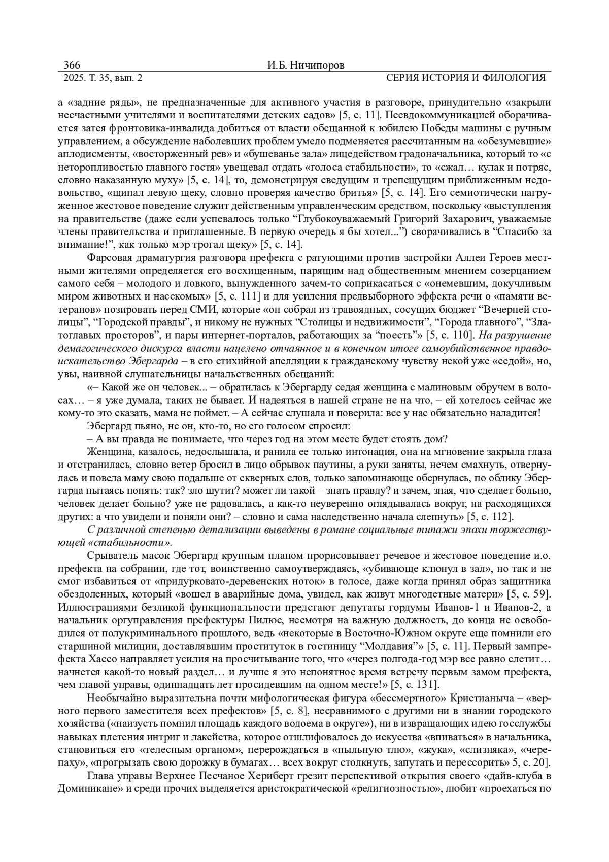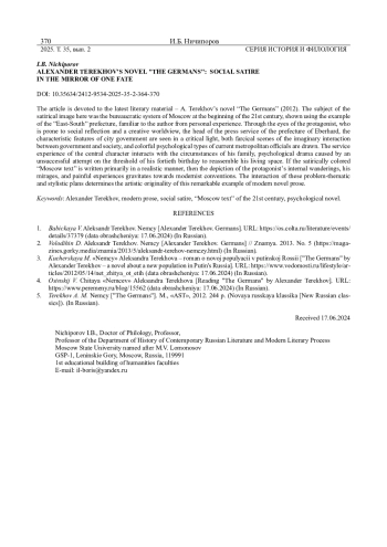 Статья посвящена новейшему литературному материалу - роману А. Терехова «Немцы» (2012). Предметом сатирического изображения послужила здесь бюрократическая система Москвы начала ХХI в., показанная на знакомом автору по личному опыту примере «Восточно-Южной» префектуры. Глазами склонного к социальной рефлексии и творческому мировосприятию главного героя - руководителя пресс-службы префектуры Эбергарда - в критическом свете увидены механизмы городского управления, прорисованы как фарсовые сцены мнимого взаимодействия власти и общества, так и колоритные психологические типажи столичных чиновников актуальной формации. Служебный опыт центрального персонажа вступает во взаимодействие с обстоятельствами его семейной, психологической драмы, вызванной неудачной попыткой на пороге сорокалетия заново пересобрать свое жизненное пространство. Если сатирически окрашенный «московский текст» написан по преимуществу в реалистической манере, то изображение внутренних блужданий главного героя, его миражей, болезненных переживаний тяготеет к модернистской условности. Взаимодействием указанных проблемно-тематических и стилевых планов обусловлена художественная самобытность этого примечательного образца современной романной прозы.