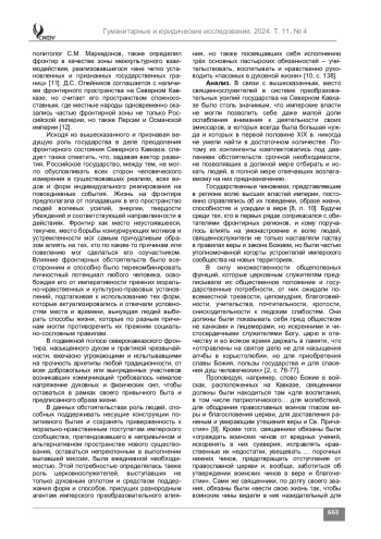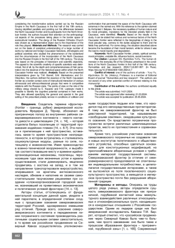 Введение. Авторы статьи, оттолкнувшись от концепта «фронтир», предложенного в своё время американским исследователем Ф. Д. Тёрнером для описания пограничных территорий Северной Америки и характера развивавшихся там процессов вмененной трансформации, производимой европейскими переселенцами на базе архетипов англо-саксонского наследия, использовали его в качестве установочной модели для рассмотрения преобразовательных действий, производившихся со стороны Российской империи на Северном Кавказе в первой половине XIX века. Выявив параллели и указав на отличия северокавказского фронтира и его участников от фронтира североамериканского, авторы сосредоточили своё внимание на антропологических аспектах, совершавшихся процессов в пограничном пространстве социокультурной переходности, выбрав в качестве репрезентативного объекта священнослужителей Русской Православной церкви в силу важности исполняемой ими роли.