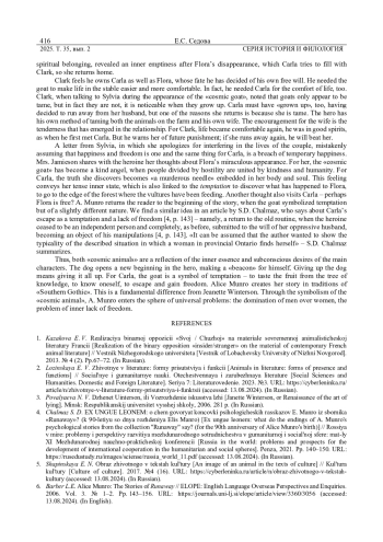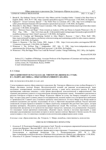 6. Barber L. E. Alice Munro: The Stories of Runaway // ELOPE: English Language Overseas Perspectives and Enquiries. 2006. Vol. 3. № 1-2. Pp. 143-156. URL: https://journals.uni-lj.si/elope/article/view/3360/3056 (дата обращения: 13.08.2024).