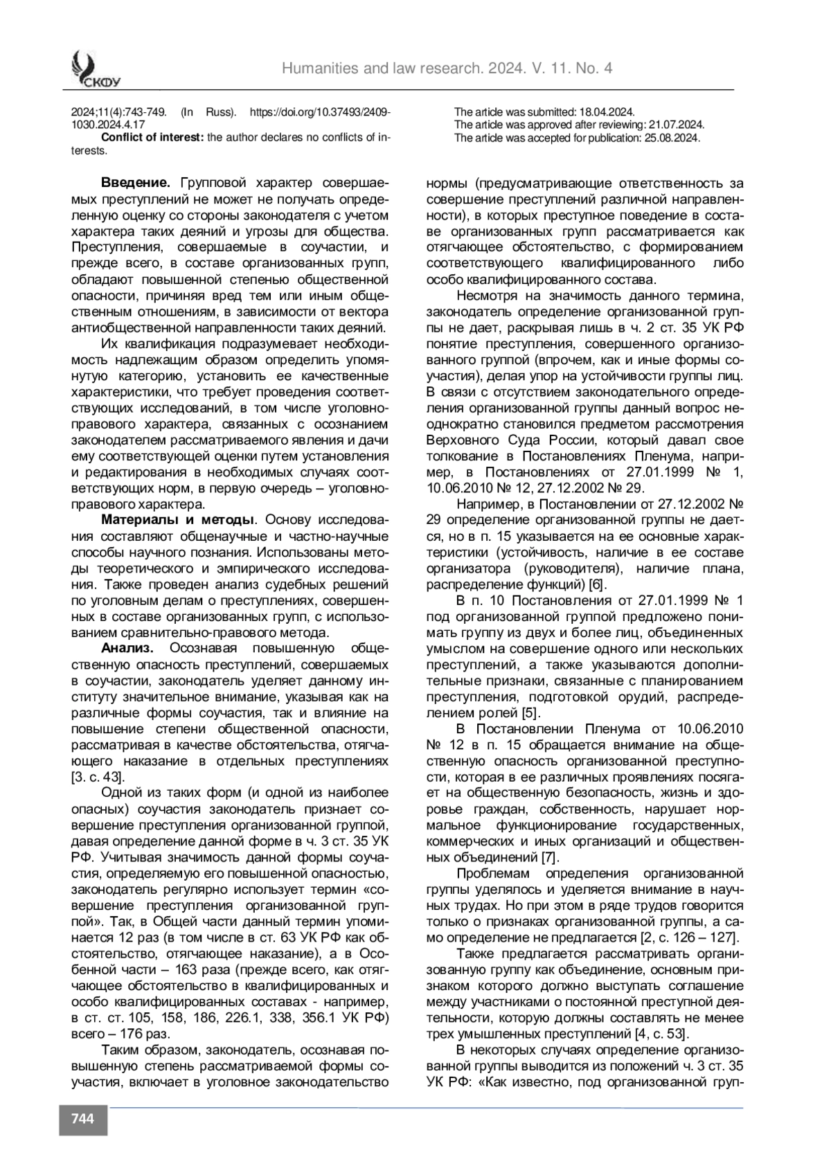 Результаты. Проведенное исследование позволяет сделать вывод, что, несмотря на активное использование рассматриваемого понятия, законодателем не во всех случаях учитывается повышенная общественная опасность совершения преступления организованной группой, что подлежит исправлению путем внесения соответствующих изменений в уголовное законодательство, связанных с включением в перечень квалифицирующих обстоятельств ряда норм, устанавливающих ответственность за отдельные преступления, такого отягчающего обстоятельства как совершение преступления организованной группой, признанием его особо отягчающим обстоятельством с установлением соответствующих санкций.