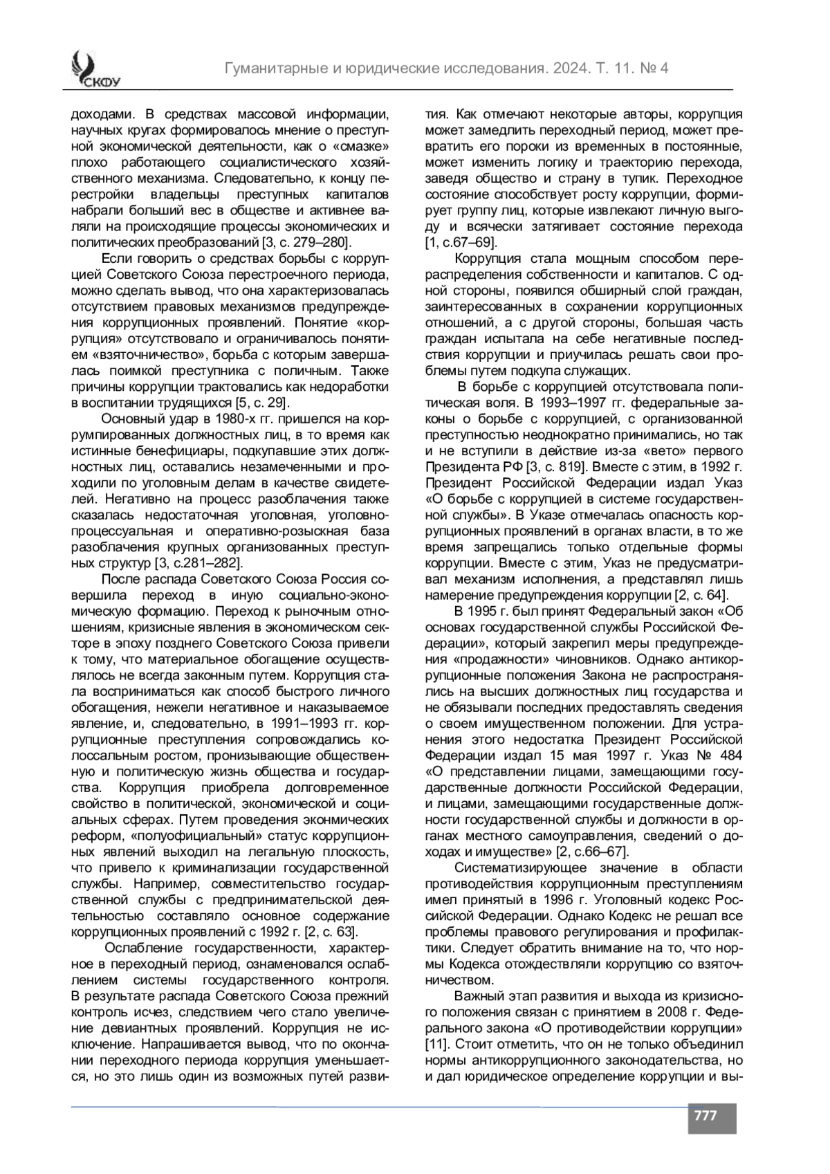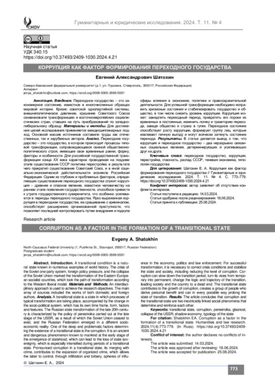 Результаты. В статье делается вывод о том, что коррупция и переходное государство – два неразрывно связанных социальных явления, детерминирующих и усиливающих друг на друга.