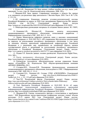 10. Осминина А.В., Шохина А.И. Отдельные аспекты использования специализированного программного обеспечения отечественной разработки // Информационные технологии в УИС. 2022. № 3. С. 14-19. EDN: CZYAJO