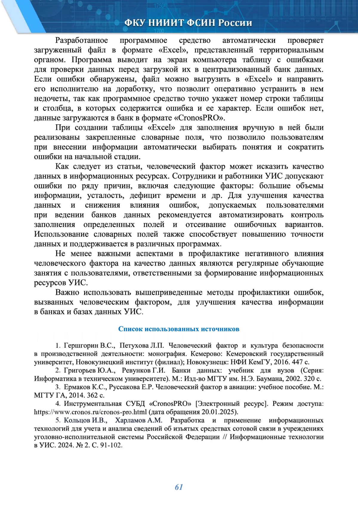 5. Кольцов И.В., Харламов А.М. Разработка и применение информационных технологий для учета и анализа сведений об изъятых средствах сотовой связи в учреждениях уголовно-исполнительной системы Российской Федерации // Информационные технологии в УИС. 2024. № 2. С. 91-102. EDN: PBBGJS