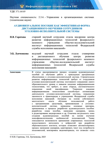В статье рассматривается процесс создания аудиовизуальных пособий по обучению работе с прикладным программным обеспечением в уголовно-исполнительной системе. Стремительное развитие информационных технологий требует от сотрудников уголовно-исполнительной системы постоянного повышения своего образовательного уровня и навыков владения информационными технологиями, что требует, в свою очередь, систематического повышения своей квалификации. Уверенное владение информационными технологиями способствует оптимизации деятельности уголовно-исполнительной системы, повышению законности и правопорядка в учреждениях Федеральной службы исполнения наказаний. Авторами на основе собственного многолетнего опыта обучения пользователей работе с программными средствами, применяемыми в уголовно-исполнительной системе, приведены основные критерии, применяемые в процессе разработки аудиовизуального пособия: разработка плана пособия, написание сценариев, запись и редактирование видеороликов и др. Отмечена актуальность темы создания аудиовизуальных пособий на основе изучения психофизиологических особенностей пользователей. Также описываются возможности применения современных технологий искусственного интеллекта и нейросетей при разработке образовательного контента, которые позволяют автоматизировать процесс написания сценариев, адаптировать текст под потребности пользователей, монтировать видеоматериалы, что позволит стать одним из рабочих инструментов преподавателя, экономя время и повышая качество образовательного контента.