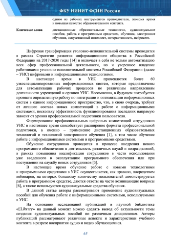 7. Лунченкова Э.Б., Горячева Н.В. Аудиовизуальные пособия как элементы информационной образовательной среды уголовно-исполнительной системы // Информационные технологии в УИС. 2021. № 2. С. 79-85. EDN: TBYXFD