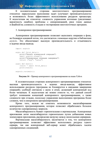 Статья посвящена основным принципам, применению и развитию асинхронного программирования на языке Python. Показано, что асинхронное программирование - это способ, позволяющий выполнять операции ввода-вывода и другие длительные процессы без блокировки основного потока выполнения программы. Описано, что указанный способ достигается за счет использования корутин, событийных циклов и других механизмов, позволяющих программе переключаться между разными задачами, что, в свою очередь, повышает эффективность использования ресурсов, снижает время ожидания и улучшает отзывчивость приложений, особенно в сценариях, связанных с большим количеством параллельных операций. В данной статье авторами подробно рассматриваются основные принципы асинхронного программирования на языке Python, его применение в различных сферах, включая взаимодействие с API, базами данных, возможности масштабируемости, а также перспективы развития данного подхода в будущем. Проведено сравнение асинхронного программирования с другими способами, такими, как синхронное программирование и многопоточность, показаны преимущества и недостатки каждого подхода. Приведены примеры ряда направлений разработки программных продуктов в ФСИН России, применение асинхронного программирования в которых позволит улучшить их эффективность, а также повысит качество разработанных программных средств и увеличит скорость обработки информации.