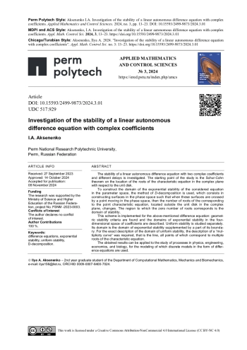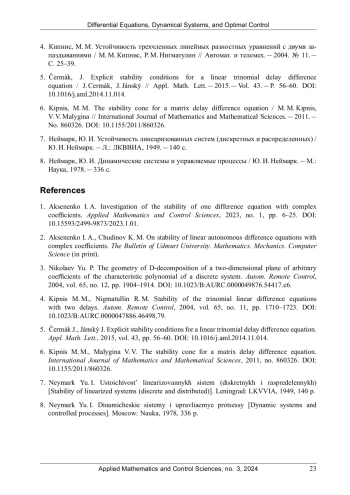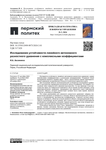 1. Аксененко, И. А. Исследование устойчивости одного разностного уравнения с комплексными коэффициентами / И. А. Аксененко // Прикладная математика и вопросы управления. - 2023. - № 1. - С. 6-25. DOI: 10.15593/2499-9873/2023.1.01 EDN: MVDEVM