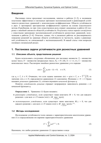 Настоящая статья продолжает исследования, начатые в работах [1; 2], и посвящена получению эффективных и наглядных признаков экспоненциальной и равномерной устойчивости разностных уравнений с комплексными коэффициентами. Области устойчивости в двух- и трехмерных пространствах коэффициентов строятся на основе классического метода D-разбиения, но при этом существенную роль играют доказанные в работе [2] теоремы о линейной связности областей устойчивости. Результаты статьи хорошо согласуются с известными признаками экспоненциальной устойчивости разностных уравнений, полученными в работах [3–6]. Отметим, однако, что в указанных работах не рассматривалось поведение решений на границах области устойчивости (в частности, задача о равномерной устойчивости, не совпадающей с экспоненциальной). В нашей статье этим вопросам посвящен специальный раздел
