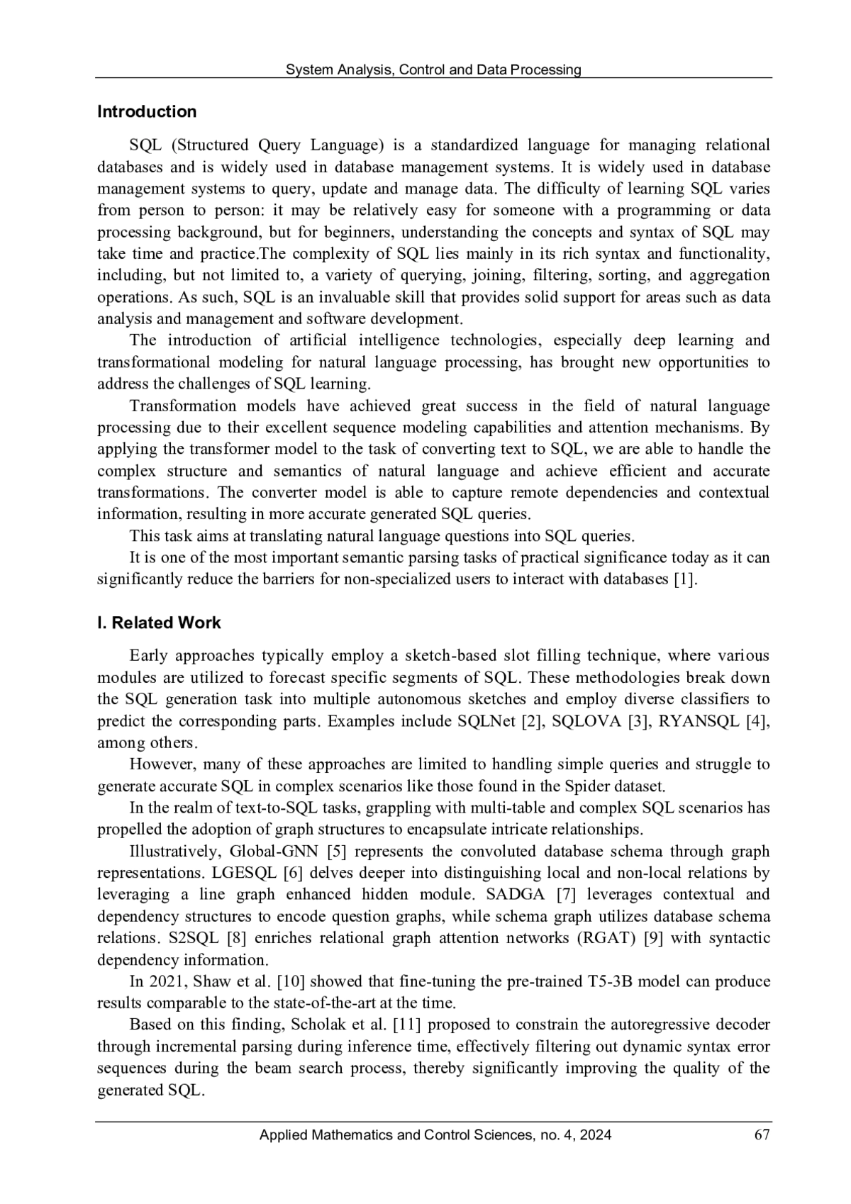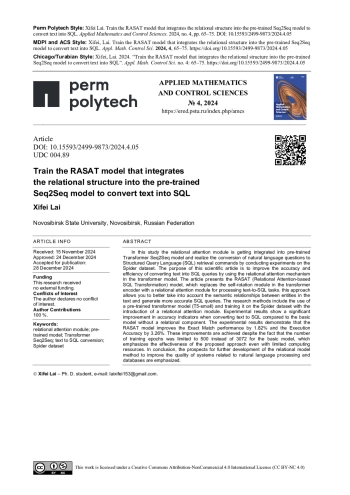В данном исследовании модуль реляционного внимания интегрируется в предобученную модель Transformer Seq2Seq и осуществляется преобразование вопросов на естественном языке в команды извлечения на языке структурированных запросов (SQL) с помощью экспериментов на наборе данных Spider. Цель этой научной статьи состоит в том, чтобы улучшить точность и эффективность преобразования текста в SQLзапросы, используя механизм реляционного внимания в модели трансформера. Статья представляет модель RASAT (переход SQL на основе реляционного внимания), которая заменяет модуль самовращения в энкодере трансформера на модуль реляционного внимания для обработки задач текст-к-SQL. Этот подход позволяет лучше учитывать семантические связи между сущностями в тексте и генерировать более точные SQLзапросы. Методы исследования включают использование предобученной модели трансформера (T5-small) и ее обучение на наборе данных Spider с введением модуля реляционного внимания. Экспериментальные результаты показывают значительное улучшение показателей точности при преобразовании текста в SQL по сравнению с базовой моделью без реляционного компонента. Экспериментальные результаты демонстрируют, что модель RASAT улучшает производительность по показателю Exact Match на 1,82 % и точность выполнения на 3,26 %. Эти улучшения достигнуты несмотря на то, что количество эпох обучения было ограничено 500 вместо 3072 для базовой модели, что подчеркивает эффективность предложенного подхода даже при ограниченных вычислительных ресурсах. В заключение подчеркиваются перспективы дальнейшего развития метода реляционной модели для улучшения качества систем, связанных с обработкой естественного языка и базами данных.