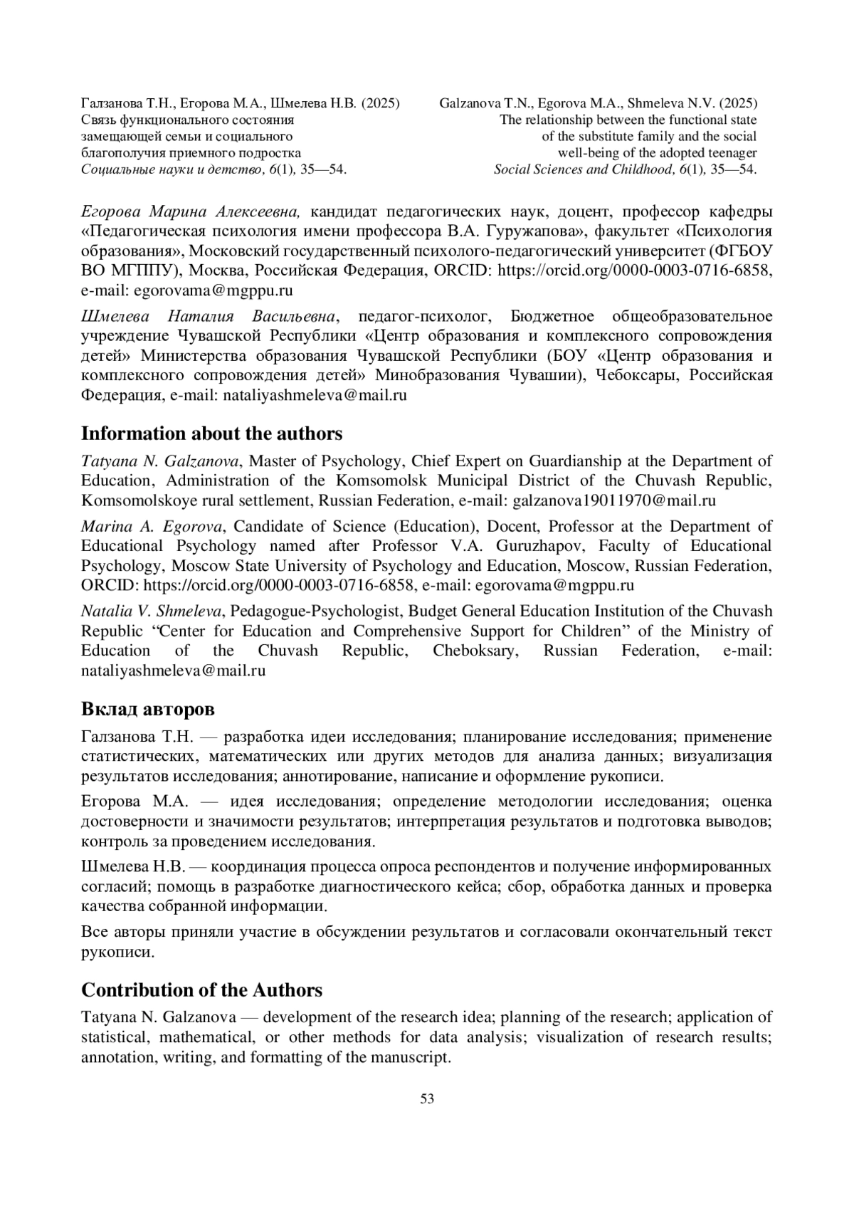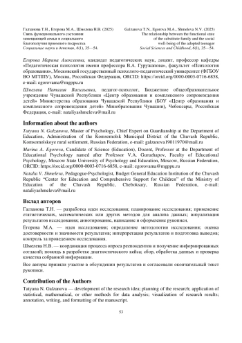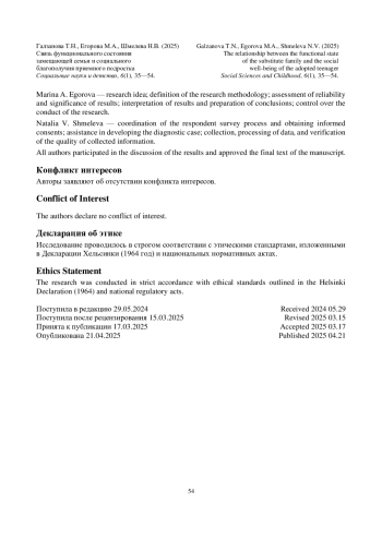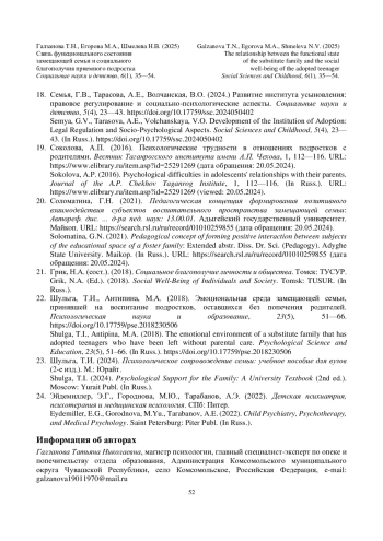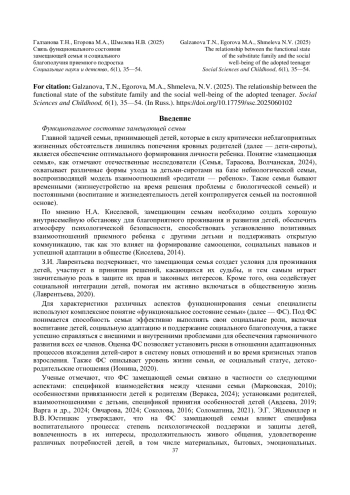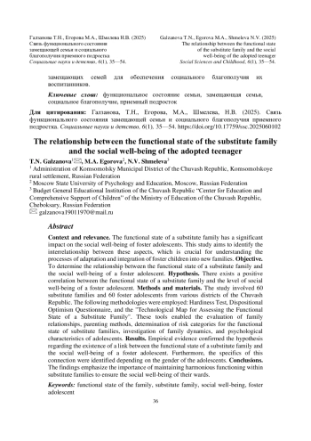 ГАЛЗАНОВА Т. Н., ЕГОРОВА М. А., ШМЕЛЕВА Н. В. СВЯЗЬ ФУНКЦИОНАЛЬНОГО СОСТОЯНИЯ ЗАМЕЩАЮЩЕЙ СЕМЬИ И СОЦИАЛЬНОГО БЛАГОПОЛУЧИЯ ПРИЕМНОГО ПОДРОСТКА // СОЦИАЛЬНЫЕ НАУКИ И ДЕТСТВО. 2025. № 1, ТОМ 6
