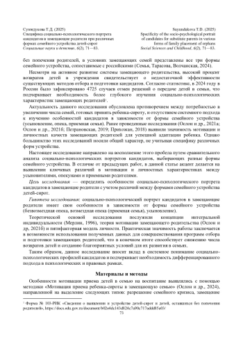 Контекст и актуальность. Проблема семейного устройства детей-сирот сохраняет актуальность в российской социальной политике. Высокий процент возвратов (4725 случаев в 2024 г.) указывает на недостатки в методах отбора кандидатов. Цель. Выявить специфику социально-психологических характеристик кандидатов при различных формах семейного устройства. Гипотеза. Социально-психологический портрет кандидатов имеет особенности в зависимости от формы семейного устройства (безвозмездная опека, возмездная опека/приемная семья, усыновление). Методы и материалы. В исследовании приняли участие 45 кандидатов (15 усыновителей, 15 опекунов, 15 приемных родителей; M~возраст = 49 ± 19 лет; 62,2% женщин; 73,3% усыновителей с высшим образованием). Применялись методики «Пятифакторный опросник» Р. МакКрае и П. Коста, «Мотивация приема ребенка-сироты в замещающую семью» В. Ослон. Результаты. Усыновители ориентированы на «самоценность ребенка», приемные родители демонстрируют высокую открытость опыту и альтруизм, опекуны мотивированы разрешением семейного кризиса. Выводы. Результаты подтверждают необходимость дифференцированного подхода к отбору и сопровождению семей.