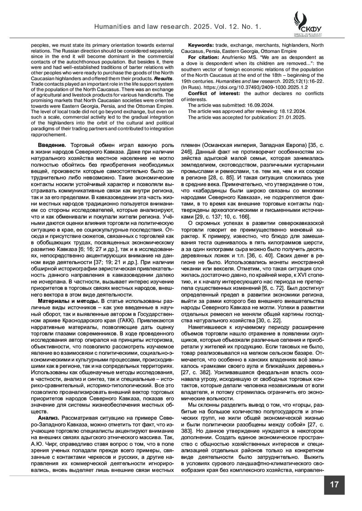 Введение. В работе раскрывается значение торговогообменадлягорцев Северного Кавказавконце XVIII– начале XIX веков. Такие экономические контакты носили устойчивый характер и позволяли выстраивать коммуникативные связи как внутри региона, так и за его пределами. В кавказоведении эта часть жизни местных народов традиционно пользуется вниманием со стороны исследователей, которые анализируют, что и как обменивали и покупали жители региона. Даются оценки влияния торговли на политическую ситуацию в крае, ее социокультурные последствия.