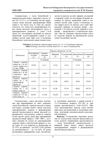 Установлены затраты сухого вещества, белка и биологической энергии корма на 1 кг абсолютного прироста, предубойной живой массы и различных тканей туши за период интенсивного доращивания телок бельгийской голубой симментальской, швицкой, голштинской, джерсейской и калмыцкой пород. Выявлено, что в равных условиях содержания у бельгийской голубой при суточном приросте более 1600 грамм в 13-месячном возрасте получена живая масса 545,1 кг, и у них от 8- до 13-месячного возраста затраты сухого вещества на 1 кг абсолютного прироста на 13,8-31,9% меньше, чем у сверстниц симментальской, швицкой, голштинской, джерсейской и калмыцкой пород, имеющих на 24-105 кг меньше живую массу даже после их 2-месячного доращивания. По затратам сухого вещества на 1 кг предубойного живого веса, массы туши и ее мякоти 15-месячные сверстницы симментальской, швицкой, голштинской, джерсейской и калмыцкой пород имели убедительное превосходство. Они трансформировали сухие части корма в предубойную живую массу на 8,2-92,8%, а в мякотные части туши на 19,0-41,0% ниже, чем 13-месячные телки бельгийской голубой породы. Аналогичная закономерность проявилась у них и при трансформации белка и энергии корма в абсолютный прирост (13,7-31,6%), в предубойную массу (6,9-23,2) и в массу туши (17,3-38,6%). Симментальские и швицкие 15-месячные телки по этим показателям занимали второе и третье места, превосходя телок бельгийской голубой породы на 0,03-0,21 кг, но уступая на 0,01-0,2 кг сверстницам голштинской, джерсейской и калмыцкой пород. Самое выгодное положение при выращивании на мясо занимают телки бельгийской, симментальской и швицкой пород. Телки остальных пород, имея при доращивании среднесуточный прирост 1200-1400 г, уступали лидерам по трансформации энергии корма. В целом изучаемые породы телок при интенсивном доращивании в 13-15-месячном возрасте достигли живой массы 435-545 кг, а рентабельность производства составила 14,46-20,23%.