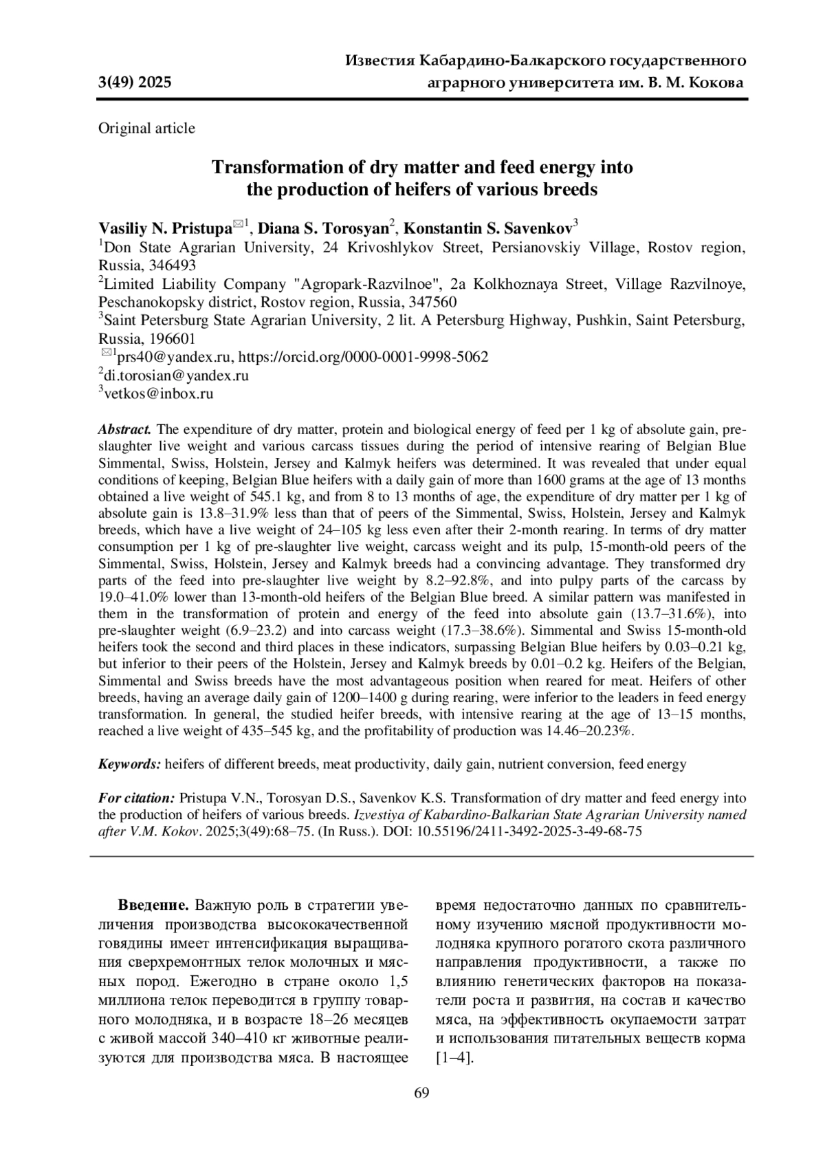 7. Торосян Д. С. Приступа В. Н. Мясная продуктивность телок различных пород при интенсивном доращивании // Вестник Донского государственного аграрного университета. 2024. № 3 (53). С. 107-116. EDN: KMBSVV
