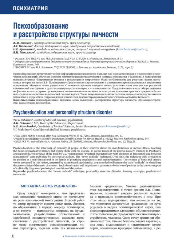 Психообразование представляет собой информирование психически больных или их родственников о проявлениях психических заболеваний, обучение основам психиатрической грамотности и навыкам совладания с болезнью. В более ранних номерах журнала «Современная терапия в психиатрии и неврологии» были опубликованы две рецензии наших постоянных авторов на книгу В. В. Пономаренко «Практическая характерология с элементами прогнозирования и управления поведением. Методика «семь радикалов». С течением времени методика только усиливает свои позиции как реальный клинический инструмент в руках практикующих психиатров и психотерапевтов. Представленные в этом обзоре рецензии на фильмы и литературные произведения, подготовленные опытными психиатрами, призваны проиллюстрировать базисные «радикалы» описанием личностей главных героев. Такая визуализация поможет врачам, пациентам и родственникам пациентов в корректном сопровождении клинически диагностированного патологического состояния больного.
