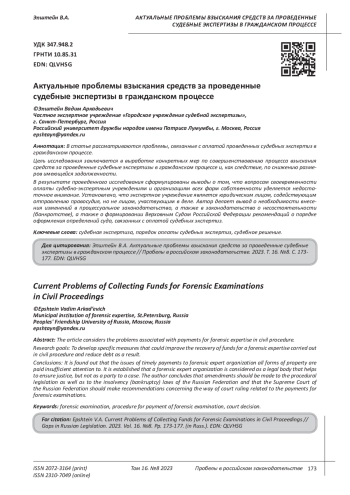 В статье рассматриваются проблемы, связанные с оплатой проведенных судебных экспертиз в гражданском процессе. Цель исследования заключается в выработке конкретных мер по совершенствованию процесса взыскания средств за проведенные судебные экспертизы в гражданском процессе и, как следствие, по снижению размеров имеющейся задолженности. В результате проведенного исследования сформулированы выводы о том, что вопросам своевременности оплаты судебно-экспертным учреждениям и организациям всех форм собственности уделяется недостаточное внимание. Установлено, что экспертное учреждение является юридическим лицом, содействующим отправлению правосудия, но не лицом, участвующим в деле. Автор делает вывод о необходимости внесения изменений в процессуальное законодательство, а также в законодательство о несостоятельности (банкротстве), а также о формировании Верховным Судом Российской Федерации рекомендаций о порядке оформления определений суда, связанных с оплатой судебных экспертиз.