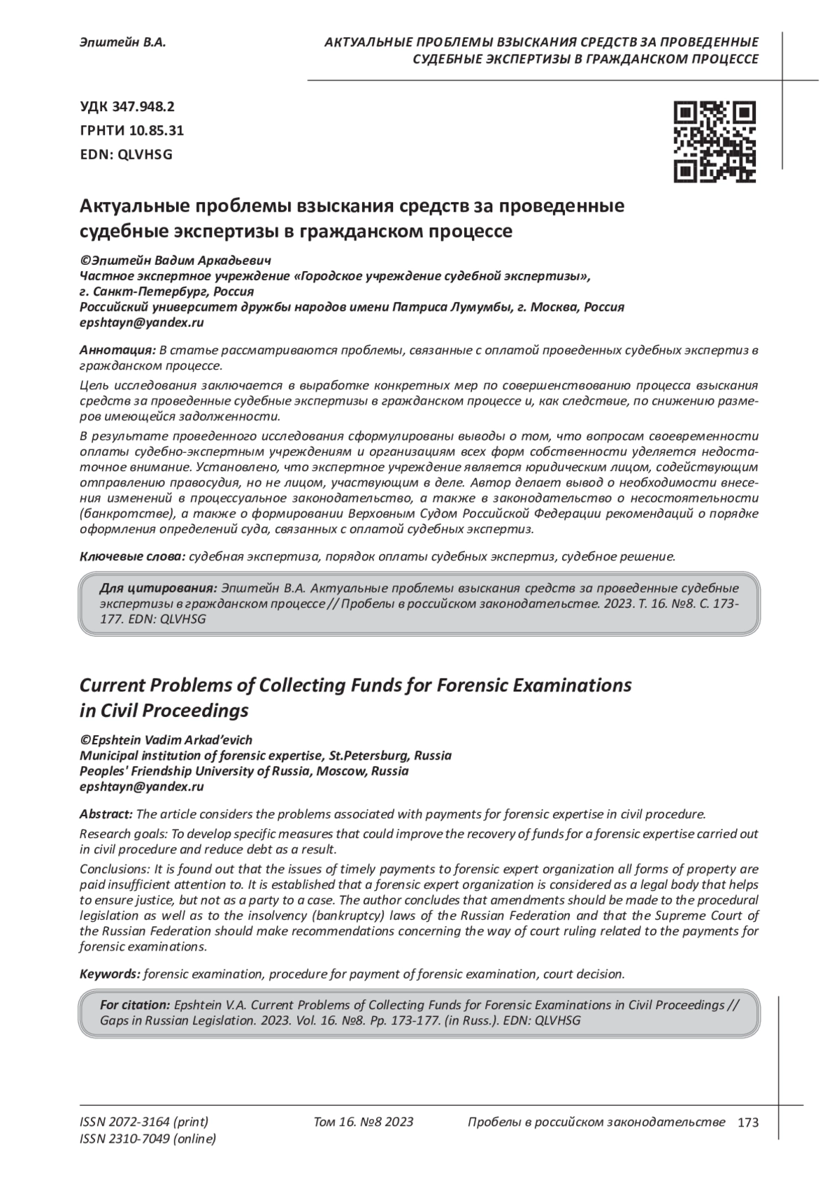 3. Кистанова Е. Проблемы оплаты экспертам вознаграждения за подготовку судебной экспертизы в арбитражном и гражданском процессе // Трудовое право. 2017. № 4. С. 61 - 70.