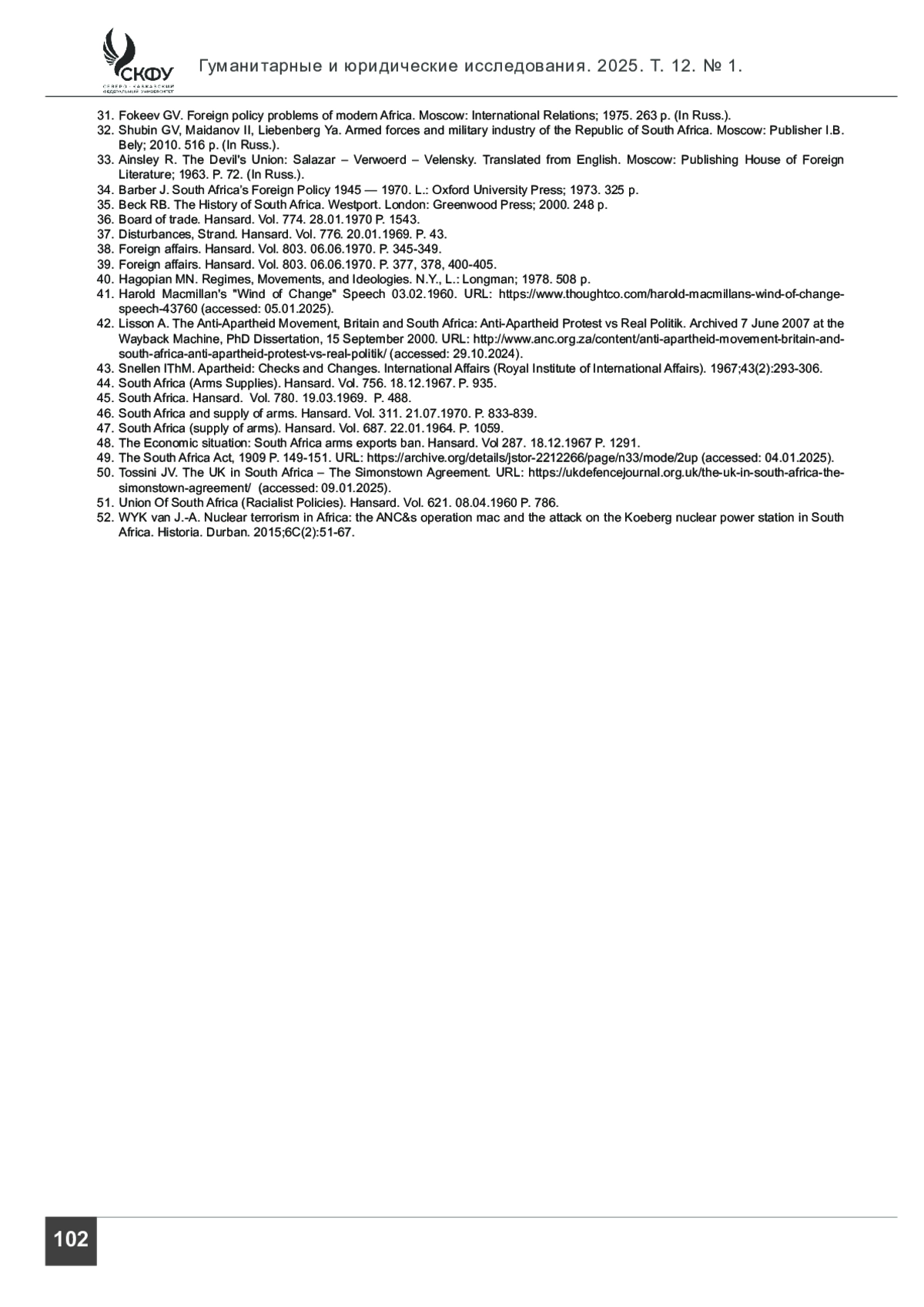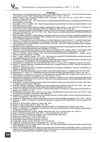 1. Архангельская А. А. Международные аспекты создания Южно-Африканского Союза в 1910 г. // Вестник Российского университета дружбы народов. Серия: Международные отношения. 2017. Т. 17. № 1. С. 150-161.