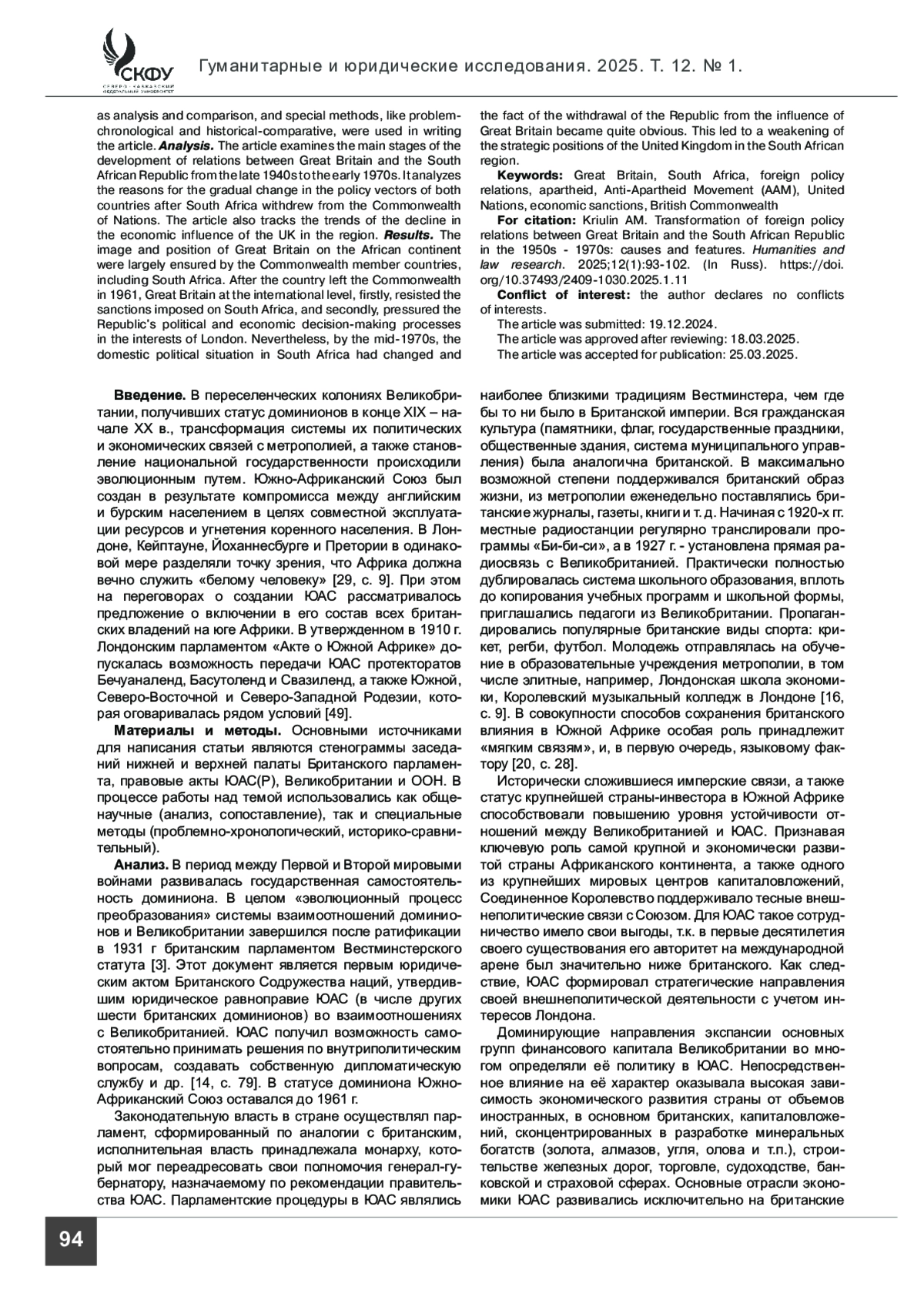 Материалы и методы. Основными источниками для написания статьи являются стенограммы заседаний нижней и верхней палаты Британского парламента, правовые акты ЮАС(Р), Великобритании и ООН. В процессе работы над темой использовались как общенаучные (анализ, сопоставление), так и специальные методы (проблемно-хронологический, историко-сравнительный).