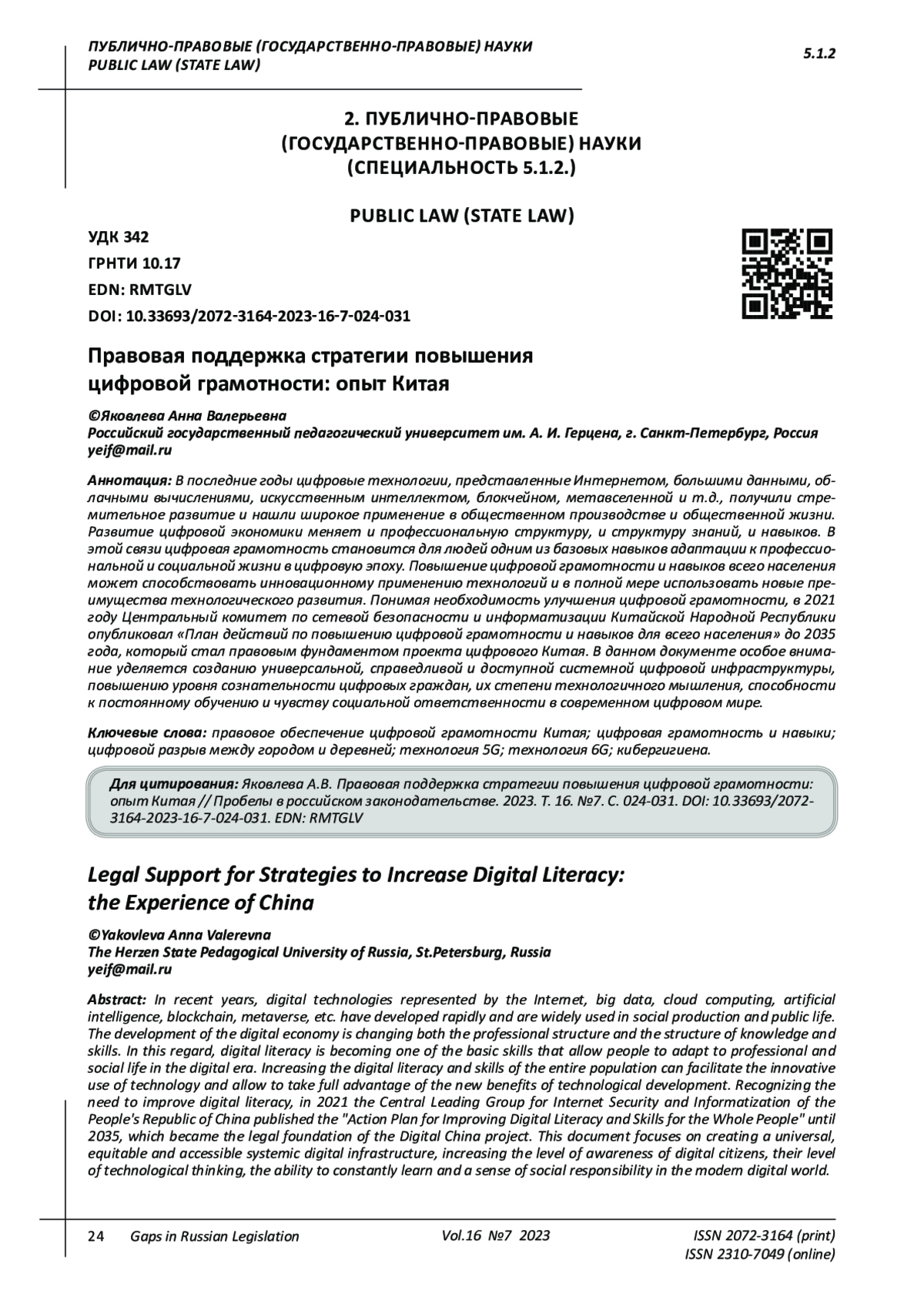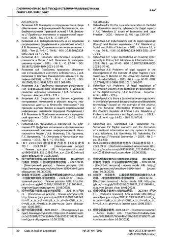 3. Яковлева А.В. Правовое обеспечение кибербезопасности в Китае / А.В. Яковлева // Информационное право. - 2021. - № 2. - С. 37-40. -. DOI: 10.18572/1999-480X-2021-2-37-40 EDN: NCYMDX