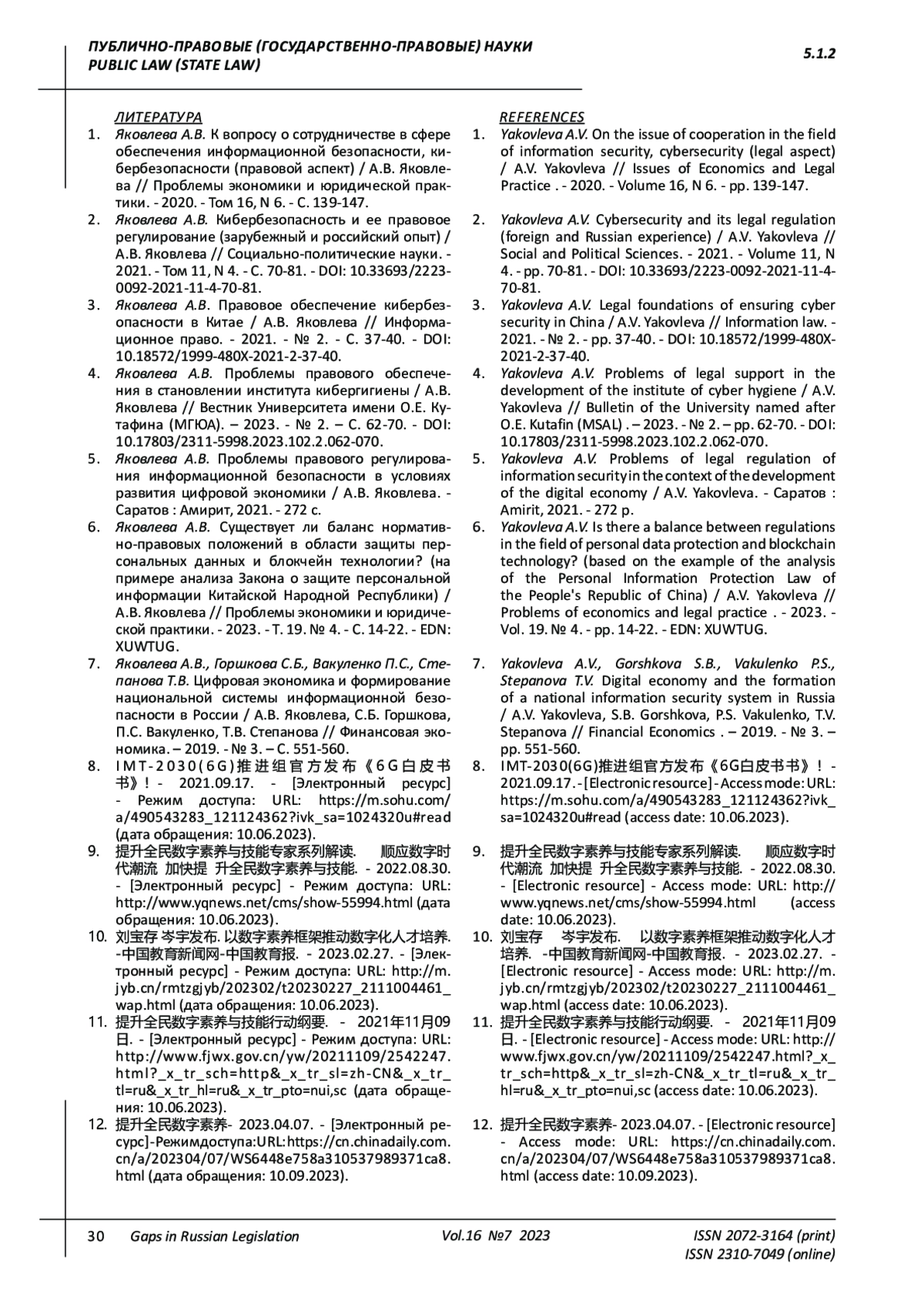 4. Яковлева А.B. Проблемы правового обеспечения в становлении института кибергигиены / А.В. Яковлева // Вестник Университета имени О.Е. Кутафина (МГЮА). - 2023. - № 2. - С. 62-70. -. DOI: 10.17803/2311-5998.2023.102.2.062-070 EDN: GCWIUR