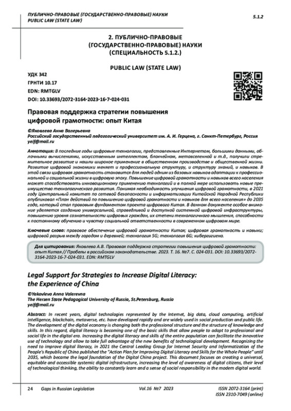 Yakovleva A.V. Legal foundations of ensuring cyber security in China / A.V. Yakovleva // Information law. - 2021. - № 2. - pp. 37-40. -. DOI: 10.18572/1999-480X-2021-2-37-40 EDN: NCYMDX
