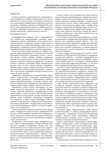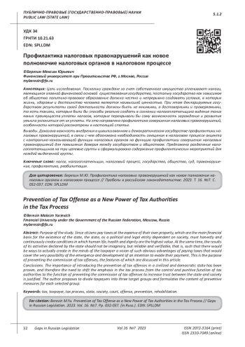 БЕРЕЗИН М. Ю. ПРОФИЛАКТИКА НАЛОГОВЫХ ПРАВОНАРУШЕНИЙ КАК НОВОЕ ПОЛНОМОЧИЕ НАЛОГОВЫХ ОРГАНОВ В НАЛОГОВОМ ПРОЦЕССЕ // ПРОБЕЛЫ В РОССИЙСКОМ ЗАКОНОДАТЕЛЬСТВЕ. 2023. Т. 16 № 7 (42 СТ.)