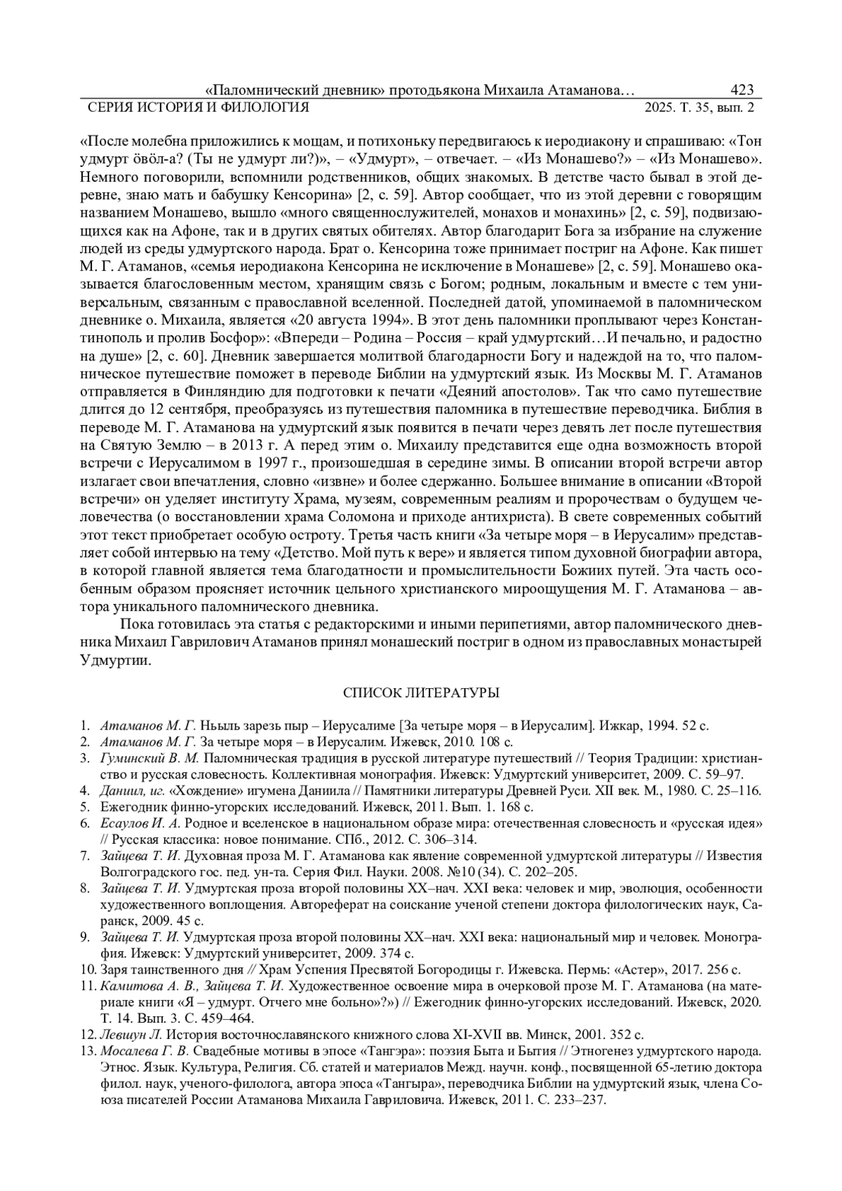 7. Зайцева Т. И. Духовная проза М. Г. Атаманова как явление современной удмуртской литературы // Известия Волгоградского гос. пед. ун-та. Серия Фил. Науки. 2008. №10 (34). С. 202-205.